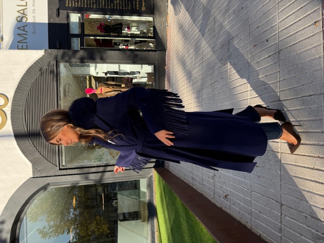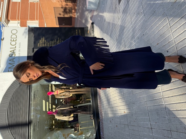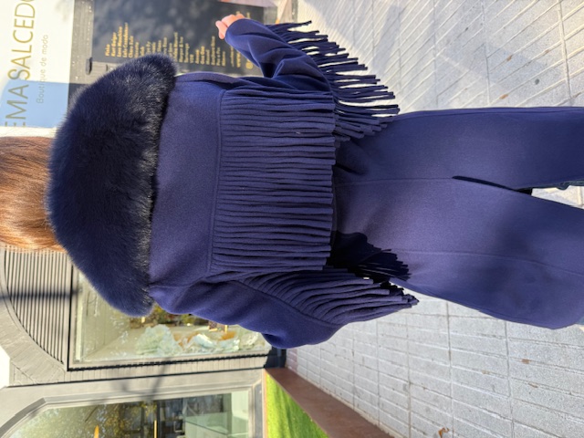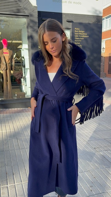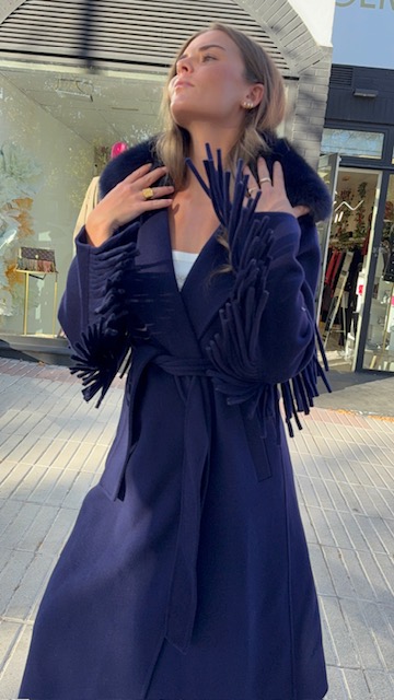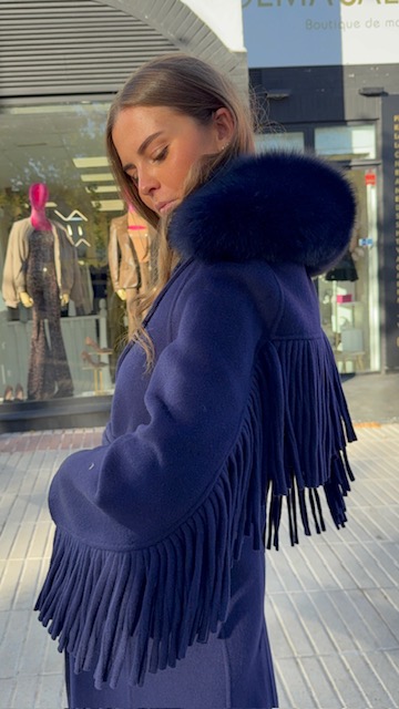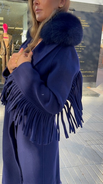 Abrigo Azul Marino de Paño con Flecos y Cuello corro loco luxo