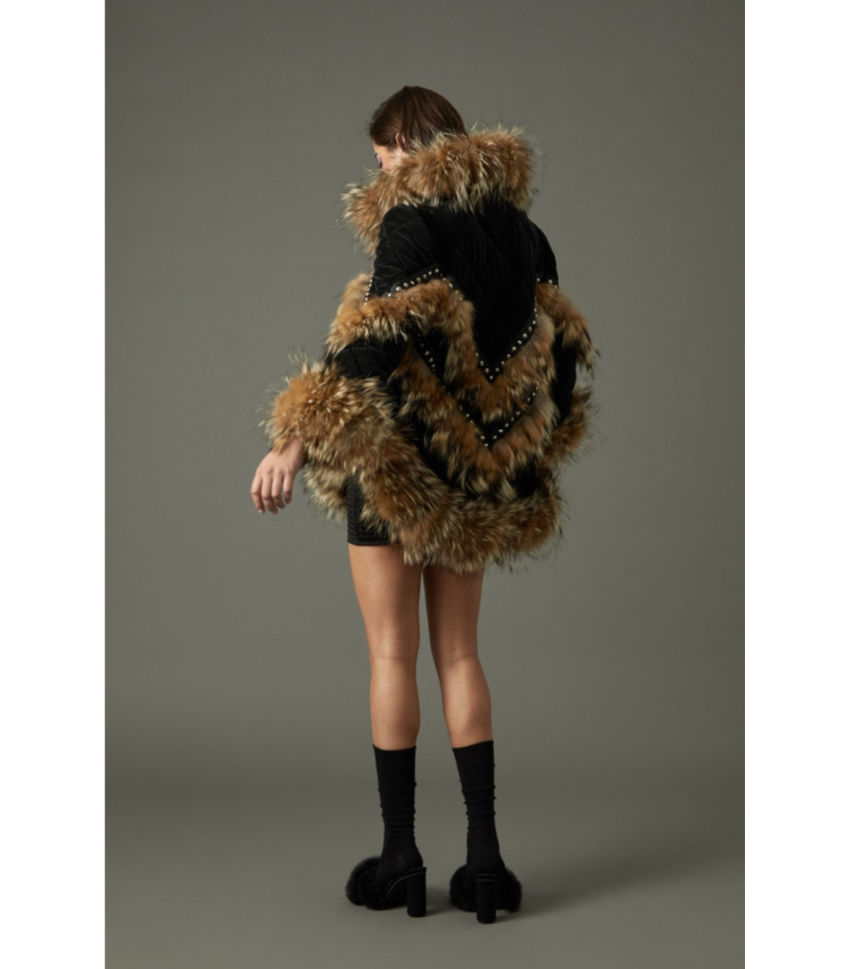 Abrigo de terciopelo negro estilo plumas con pelo de zorro natural – Tete by Odette