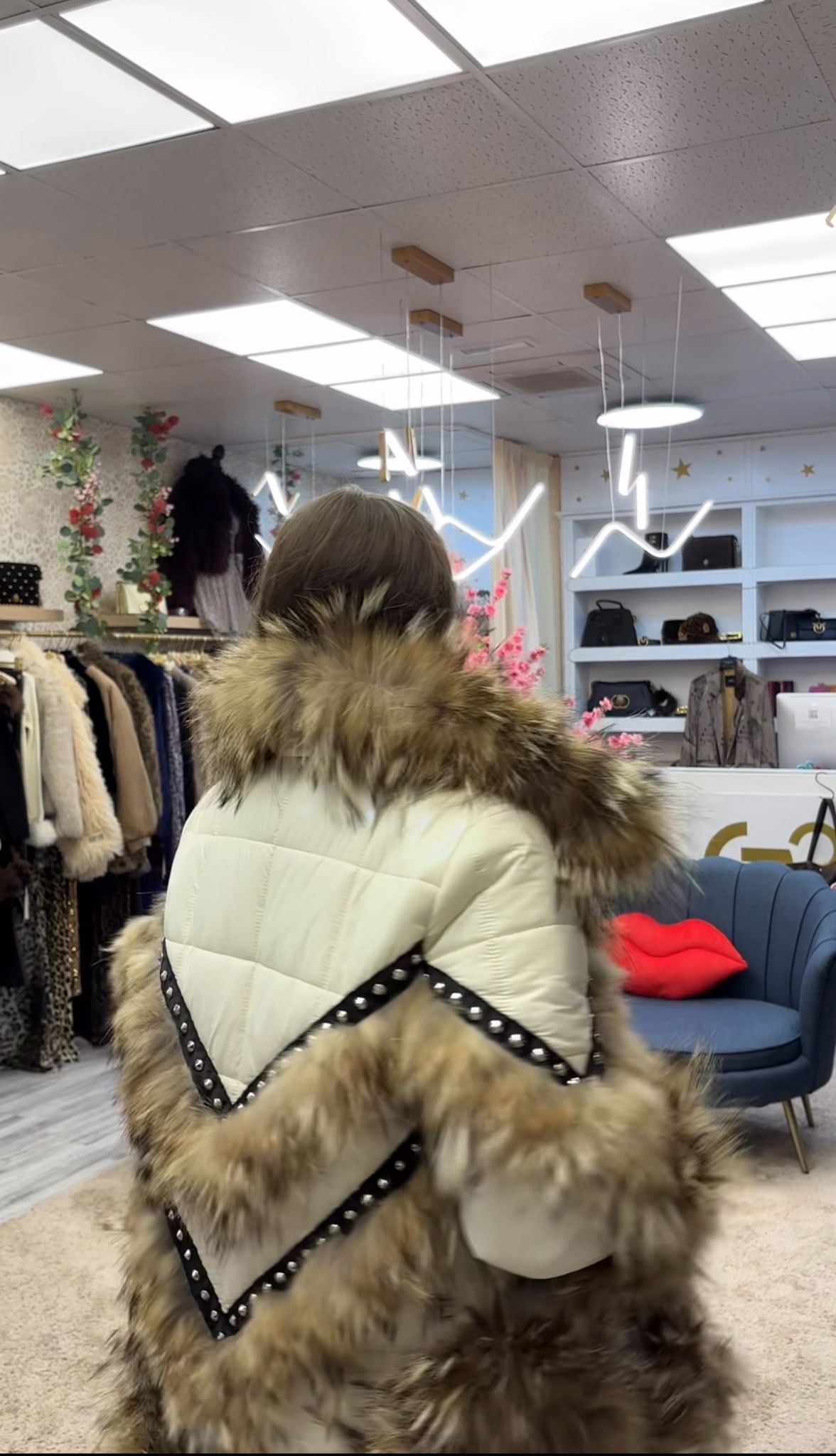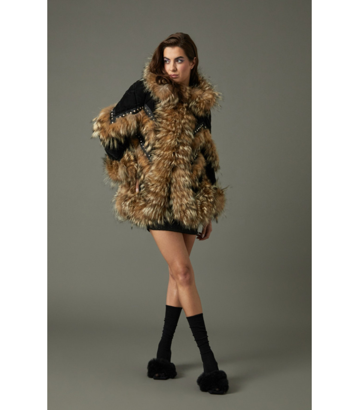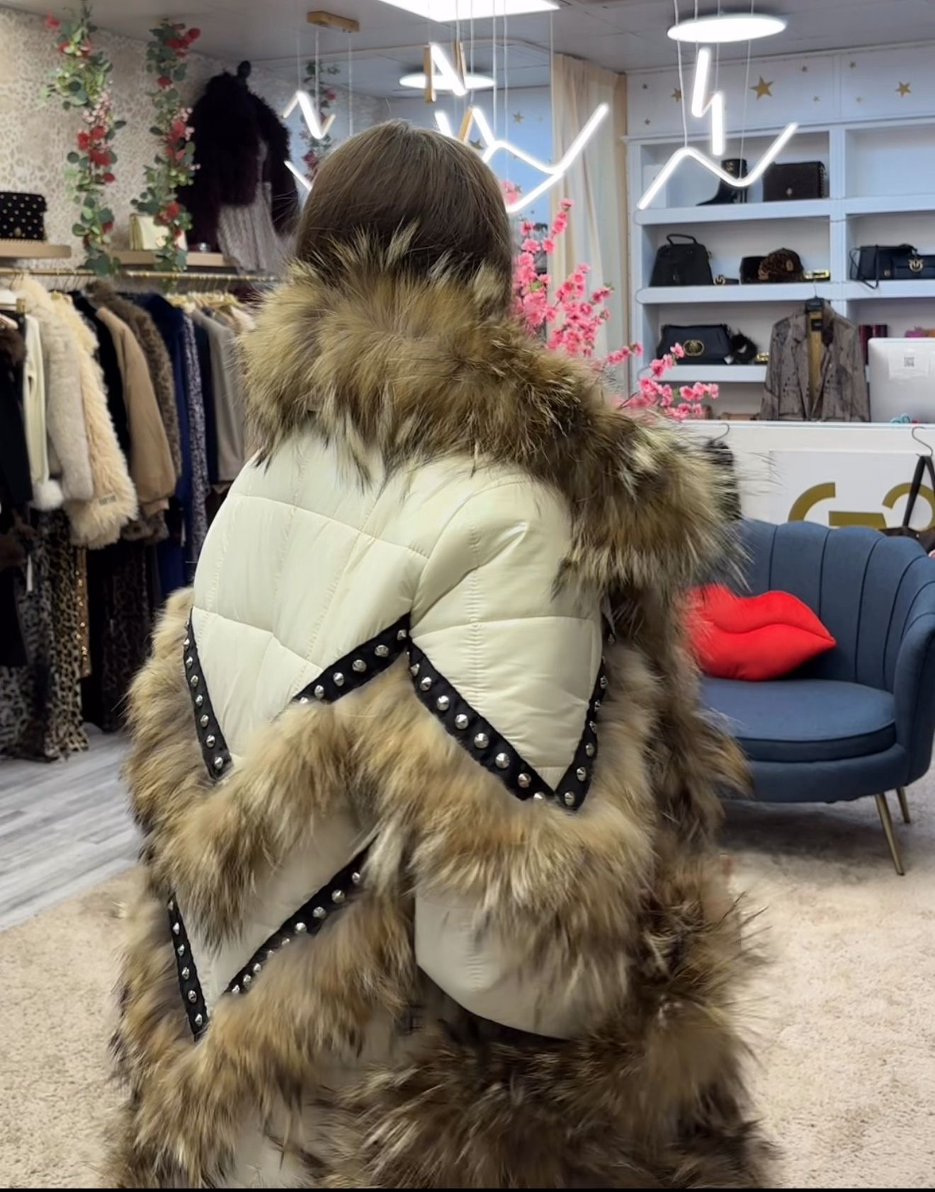 – Blanco estilo plumas con brillo sutil y pelo natural claro Diseñado con un corte oversize, cuello envolvente, aplicaciones de tachuelas metálicas y acabados impecables, este abrigo representa la máxima expresión de elegancia y vanguardia. IMPORTANTE: Esta prenda es parte de una colección exclusiva sin reposición.