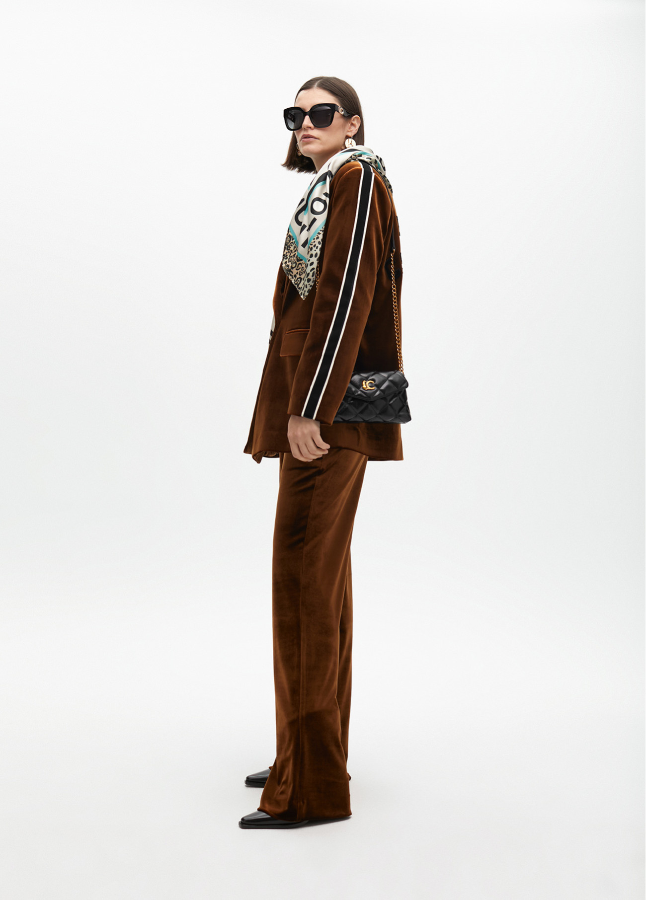 Esta americana de terciopelo de lola casademunt en tono marrón chocolate es la combinación perfecta entre estilo deportivo y sofisticación. Presenta un diseño clásico con solapa y cierre de botones, embellecido con detalles de rayas deportivas en contraste a lo largo de las mangas. El logo bordado en la espalda le da un toque distintivo, ideal para destacar en cualquier ocasión. Gracias a su tejido suave y elegante, esta chaqueta es perfecta tanto para looks de oficina como para conjuntos casual chic.