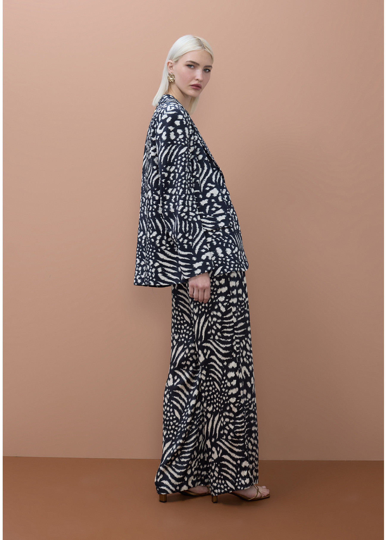 Americana de diseño fluido con vibrante estampado abstracto que aporta personalidad y sofisticación. Su corte ligero y caída natural estilizan la silueta, ofreciendo comodidad sin renunciar al estilo.