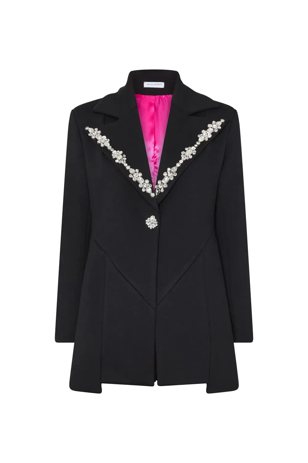 La solapa clásica se realza con pedrería cuidadosamente bordada, mientras que el interior forrado en satinado fucsia aporta un contraste vibrante y femenino. Ideal para eventos especiales, cenas elegantes o para elevar un look de noche con un toque de lujo.