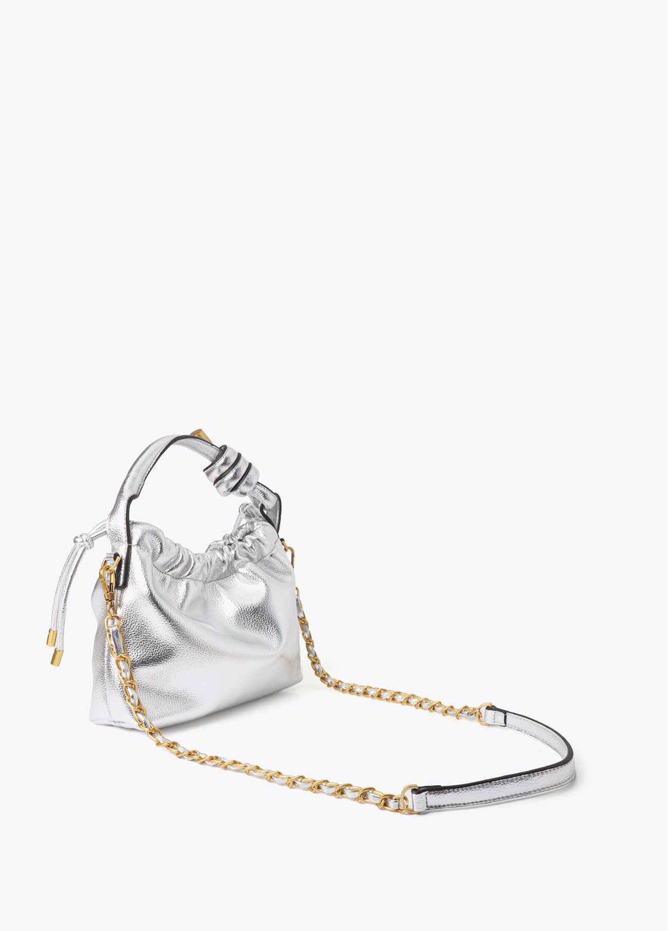 Cuenta con cierre tipo saco fruncido que combina estilo y practicidad, además de asa de cadena dorada que añade un contraste elegante y actual. Su interior forrado ofrece amplia capacidad para llevar tus imprescindibles con comodidad.