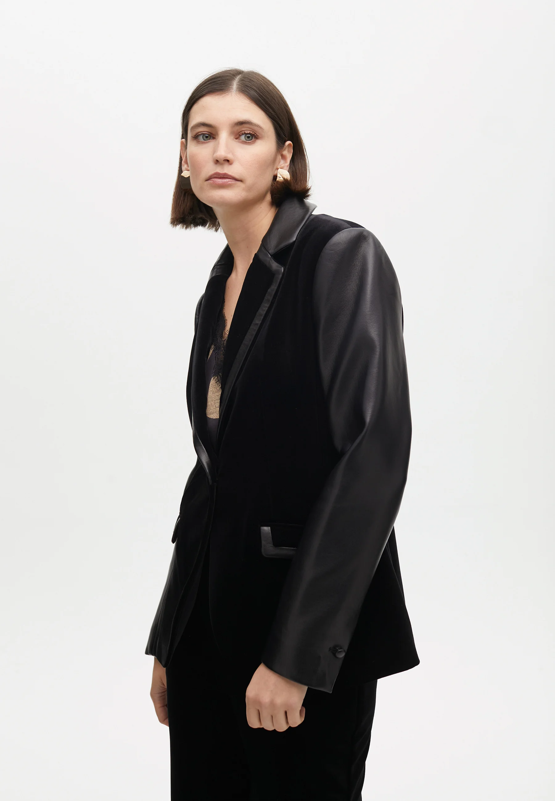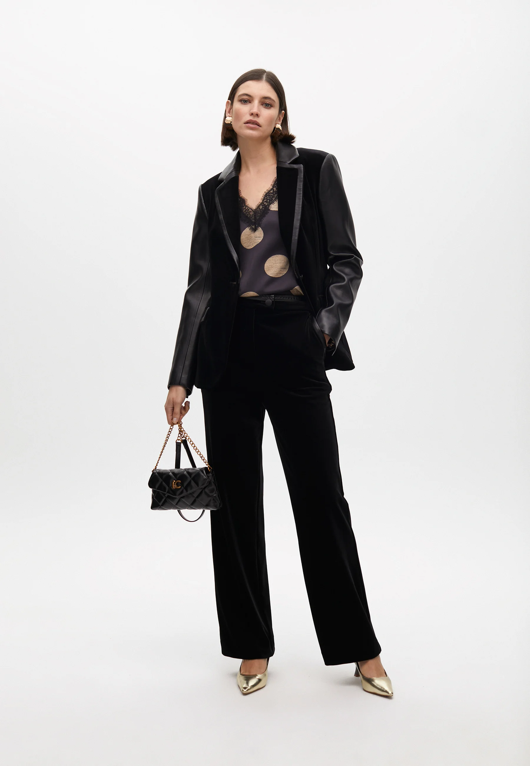 blazer de terciopelo y ecopiel de Lola Casademunt es una prenda sofisticada con carácter, ideal para destacar en looks de noche o estilismos urbanos con un toque elegante. Confeccionada en tejido de terciopelo elástico y mangas en cuero sintético, combina texturas de forma equilibrada y moderna.