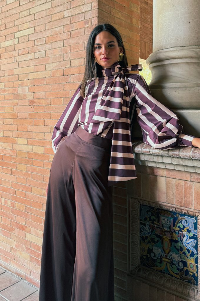Sus mangas largas abullonadas y los lazos en los puños aportan volumen y feminidad, mientras que el tejido estructurado garantiza una silueta impecable. Perfecta para combinar con pantalones de vestir o faldas de cintura alta, esta blusa es ideal para bodas, eventos y celebraciones especiales. Detalles del producto: Tejido de tafetán elástico con estampado de rayas Cuello alto con lazada multiposición Mangas largas abullonadas Detalle de lazos en los puños Diseño exclusivo de Lozania Brand