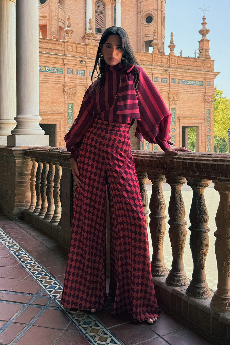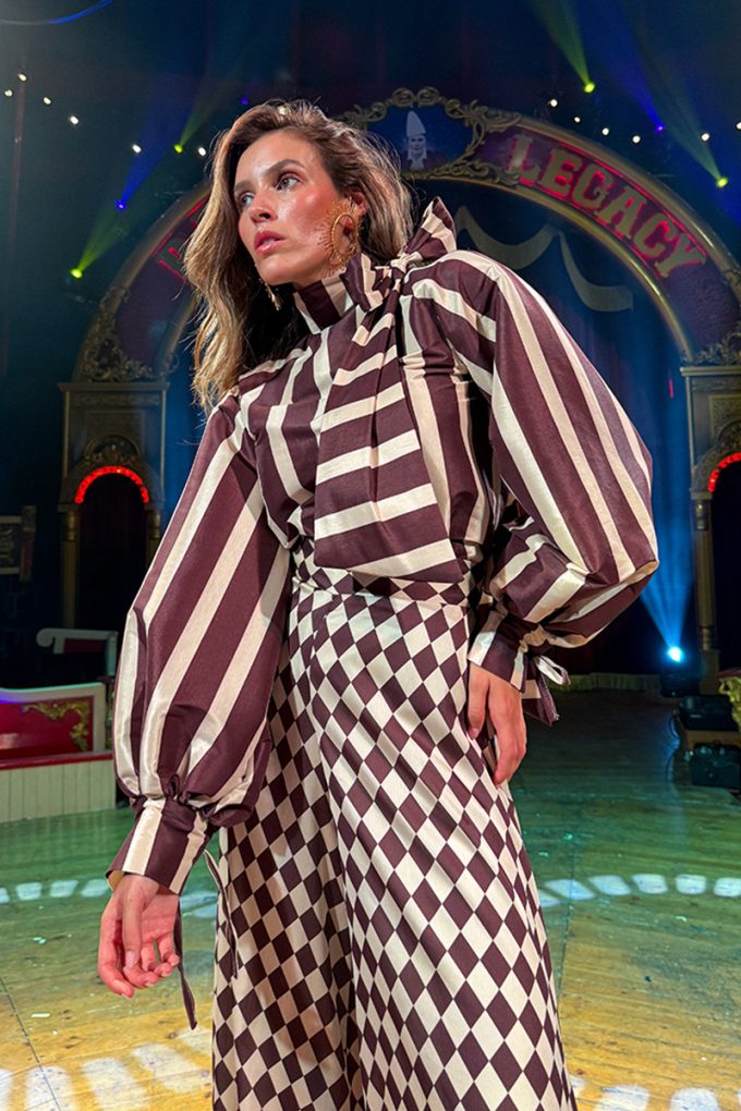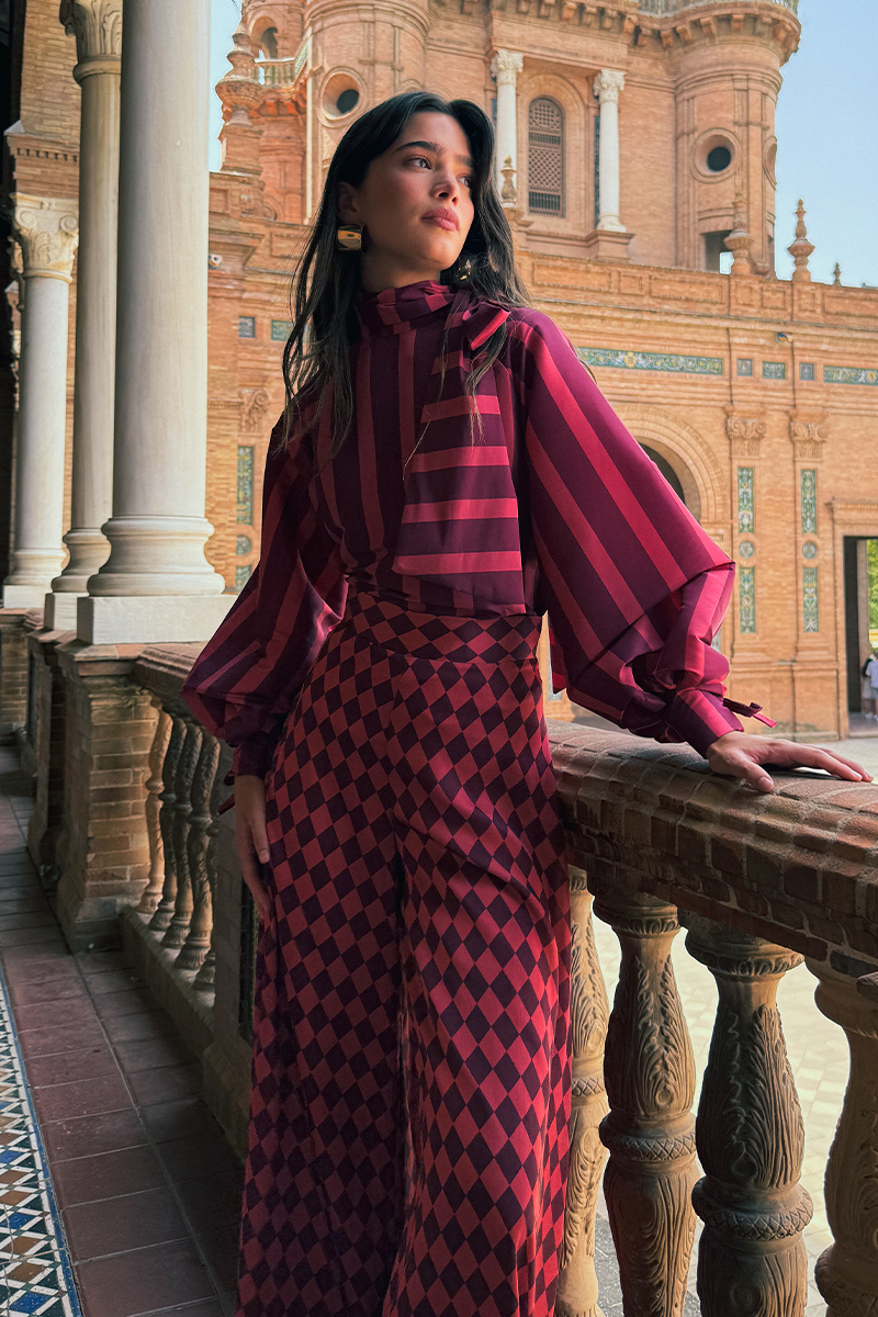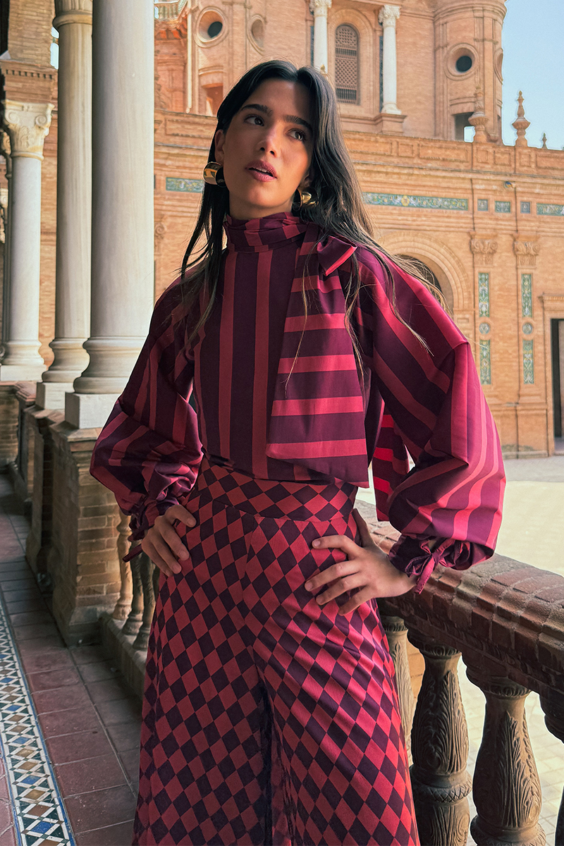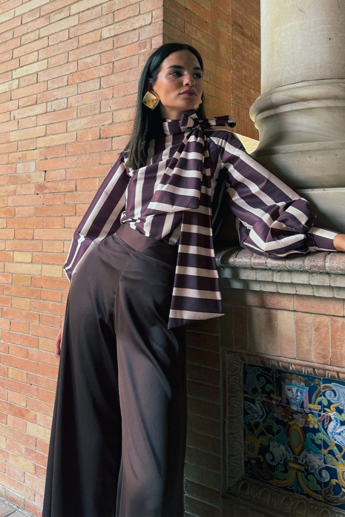 La Blusa Augusto de Lozania Brand combina elegancia, diseño y un toque contemporáneo para crear un look de invitada inolvidable. Realizada en tafetán elástico estampado de rayas, destaca por su cuello alto con lazada multiposición, que permite adaptarla a diferentes estilos, desde el más clásico hasta el más moderno.