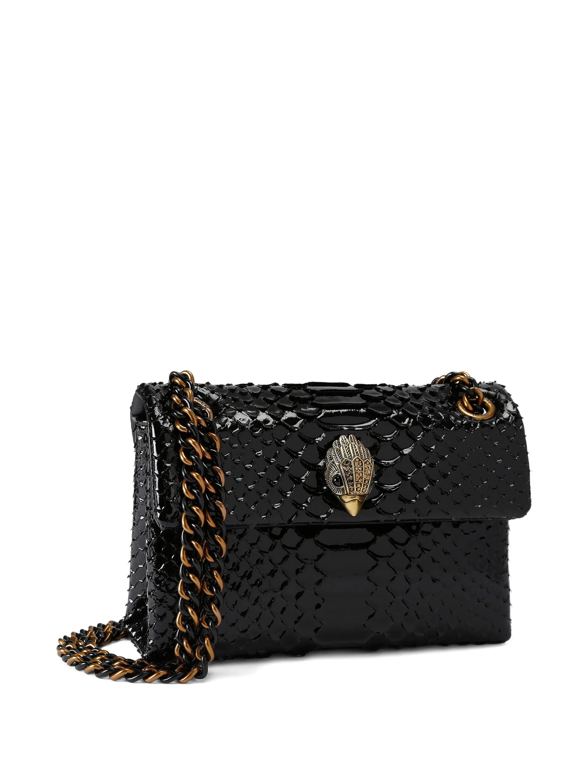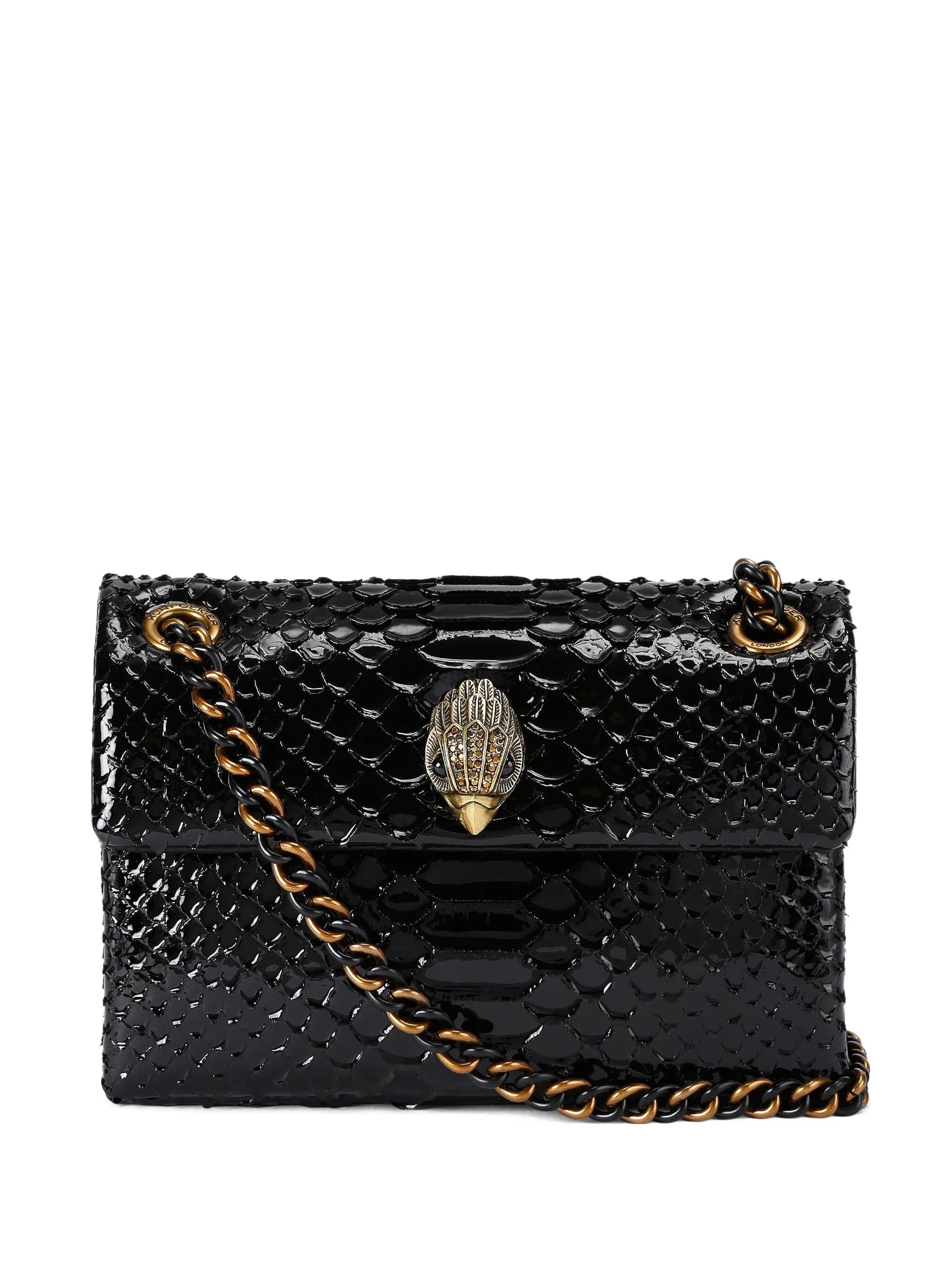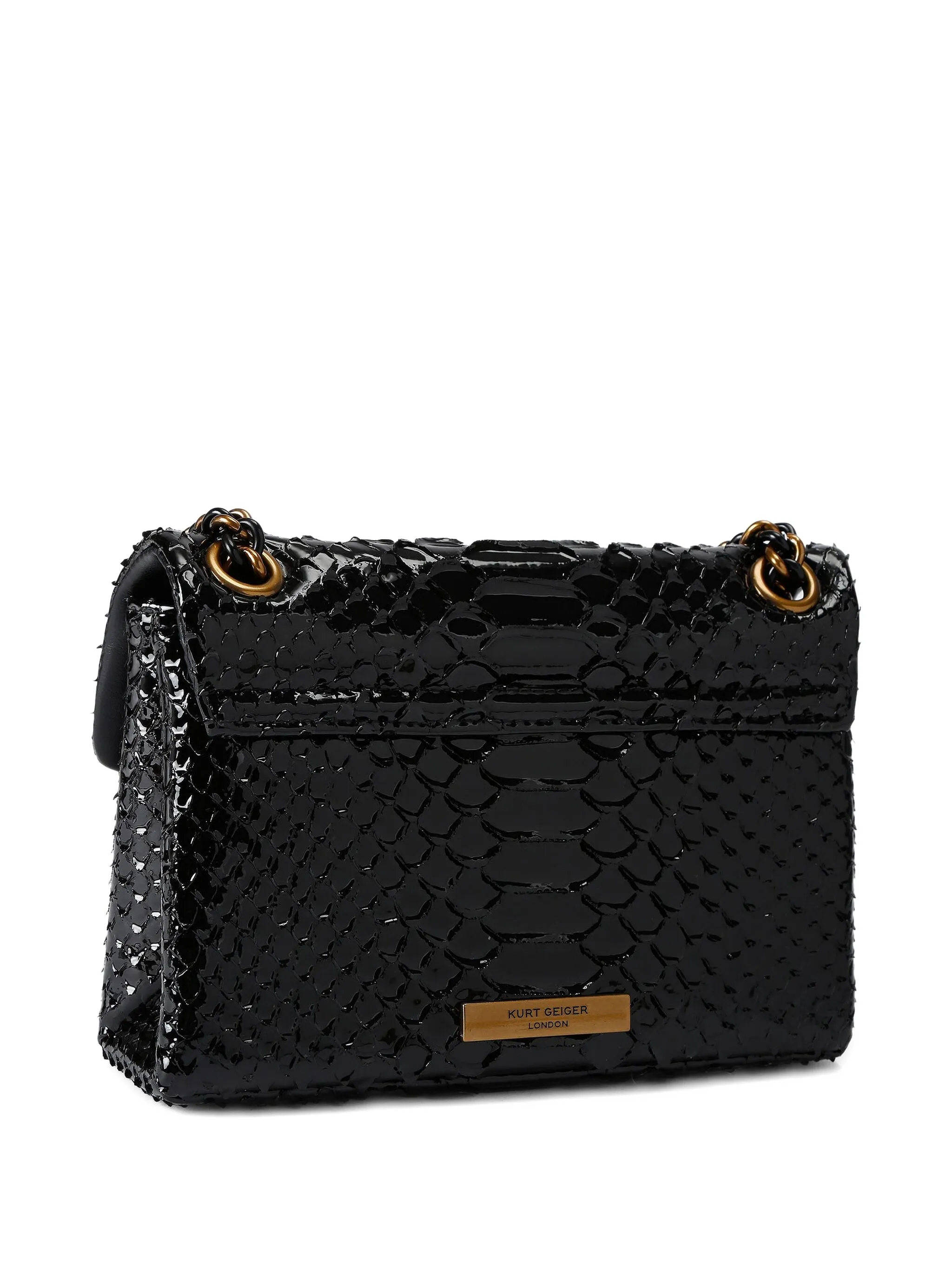 El icónico Kensington Mini de Kurt Geiger London regresa en su versión más atrevida. Este elegante bolso negro en piel efecto serpiente combina el glamour londinense con un diseño atemporal y sofisticado.
