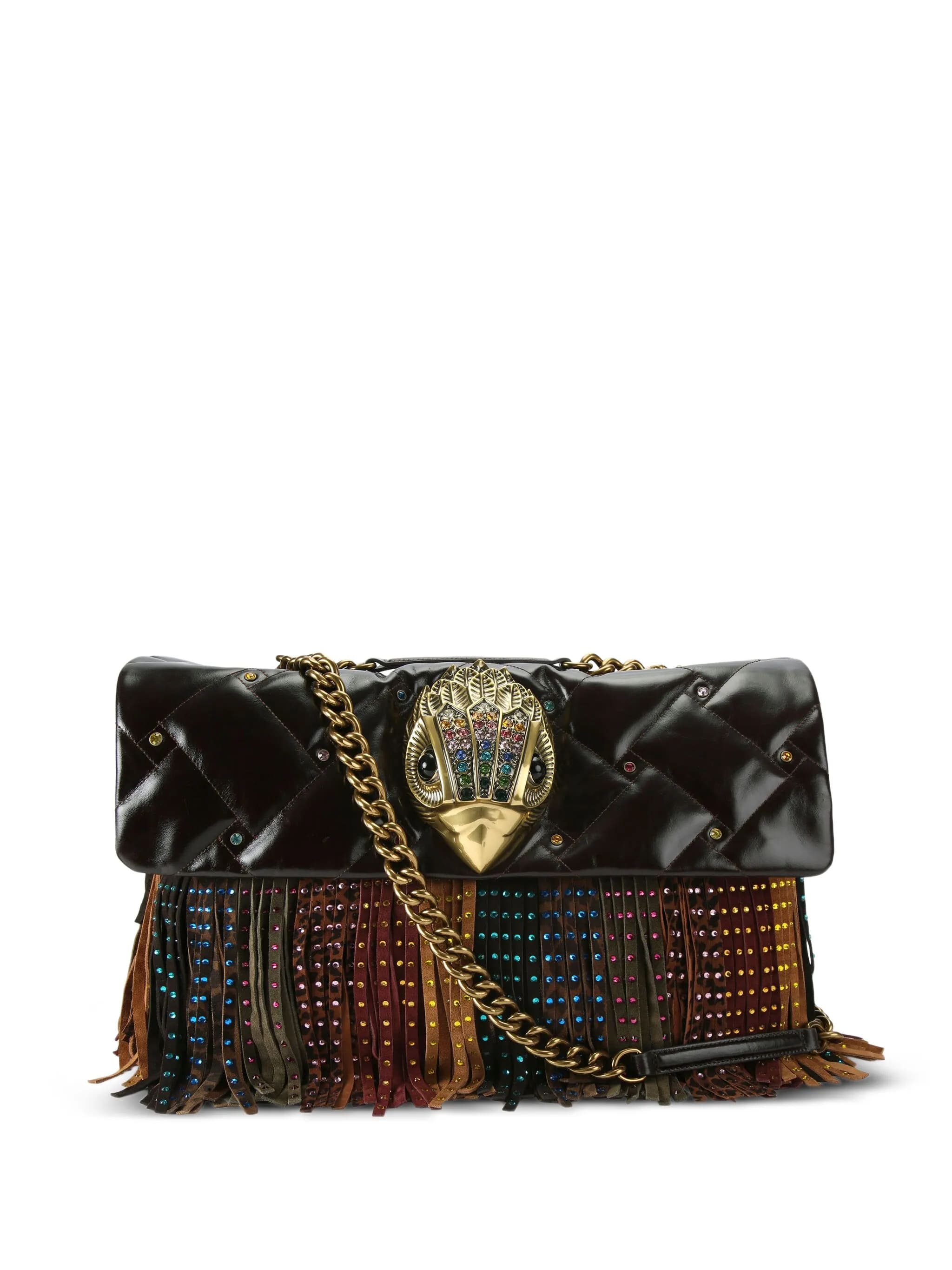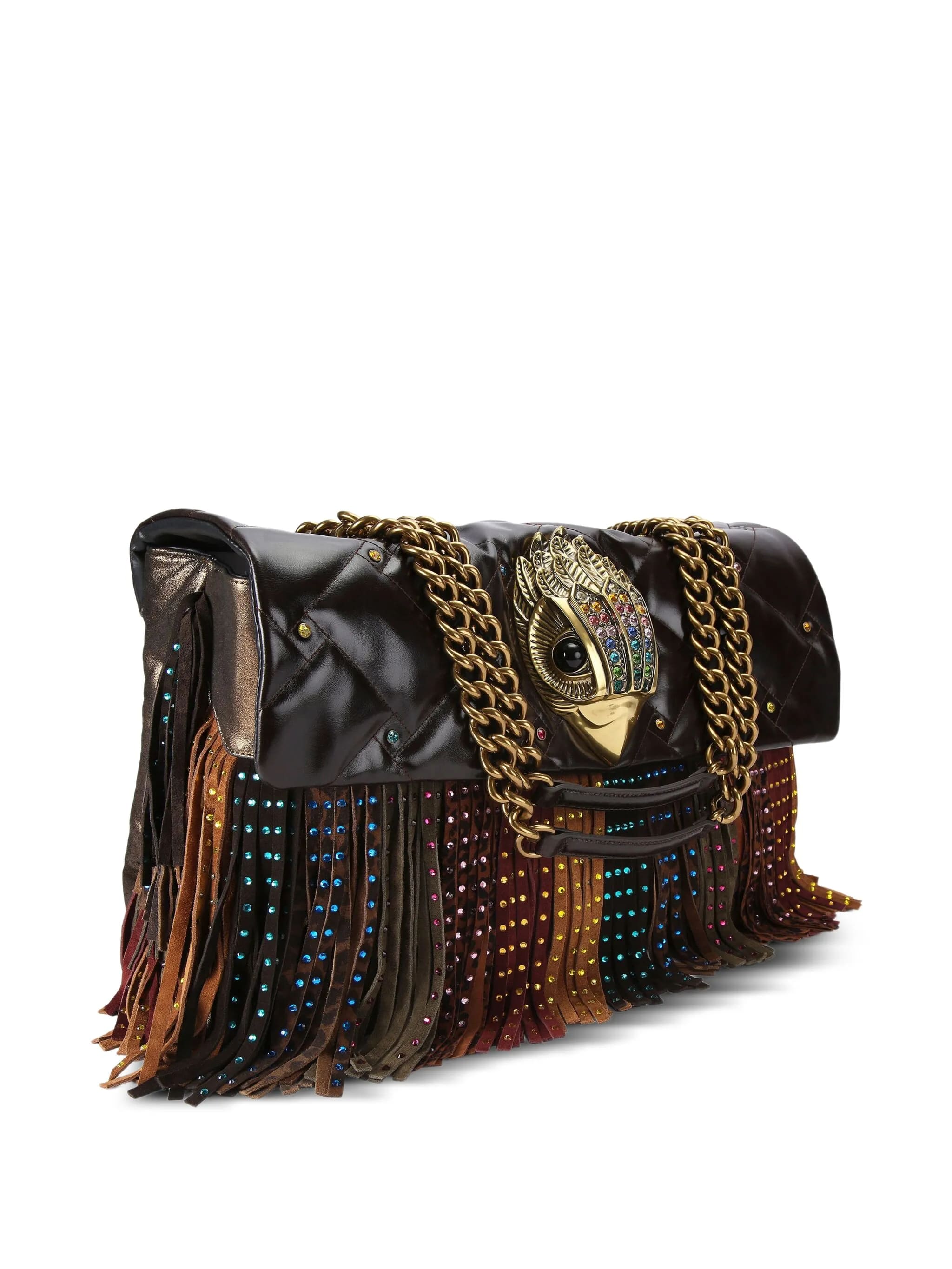 Lujoso, atrevido y absolutamente icónico. El Macro Kensington en color marrón oscuro y acabado metalizado bronce es mucho más que un bolso: es una declaración de estilo. Su diseño estructurado con borlas de flecos de ante y detalles de cristales brillantes lo convierten en el accesorio perfecto para elevar cualquier look.