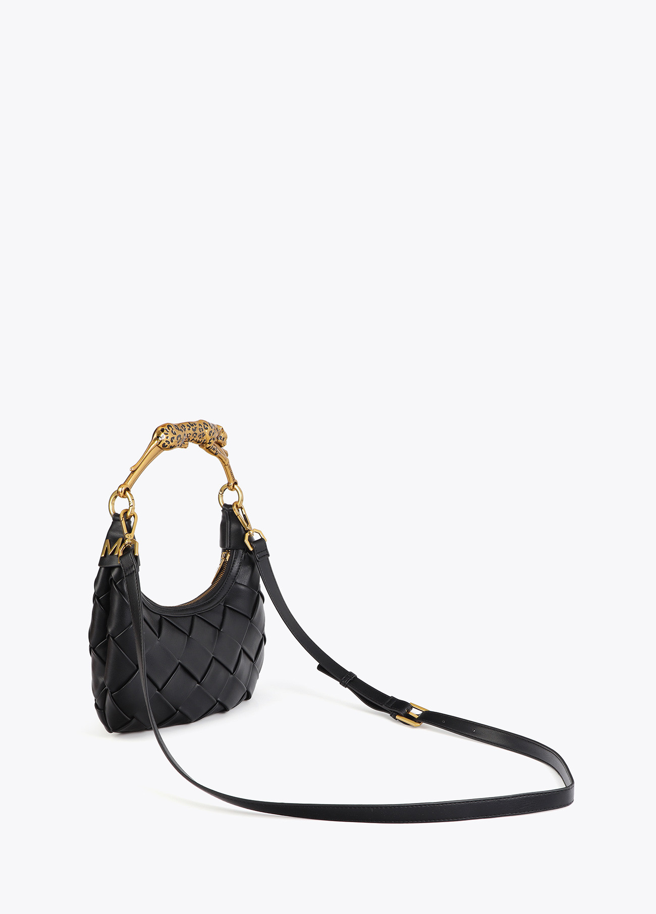 Bolso de diseño en media luna con acabados trenzados en color negro que aportan textura y elegancia atemporal. Su asa metálica en forma de leopardo dorado añade un toque sofisticado y distintivo, convirtiéndolo en una pieza protagonista.