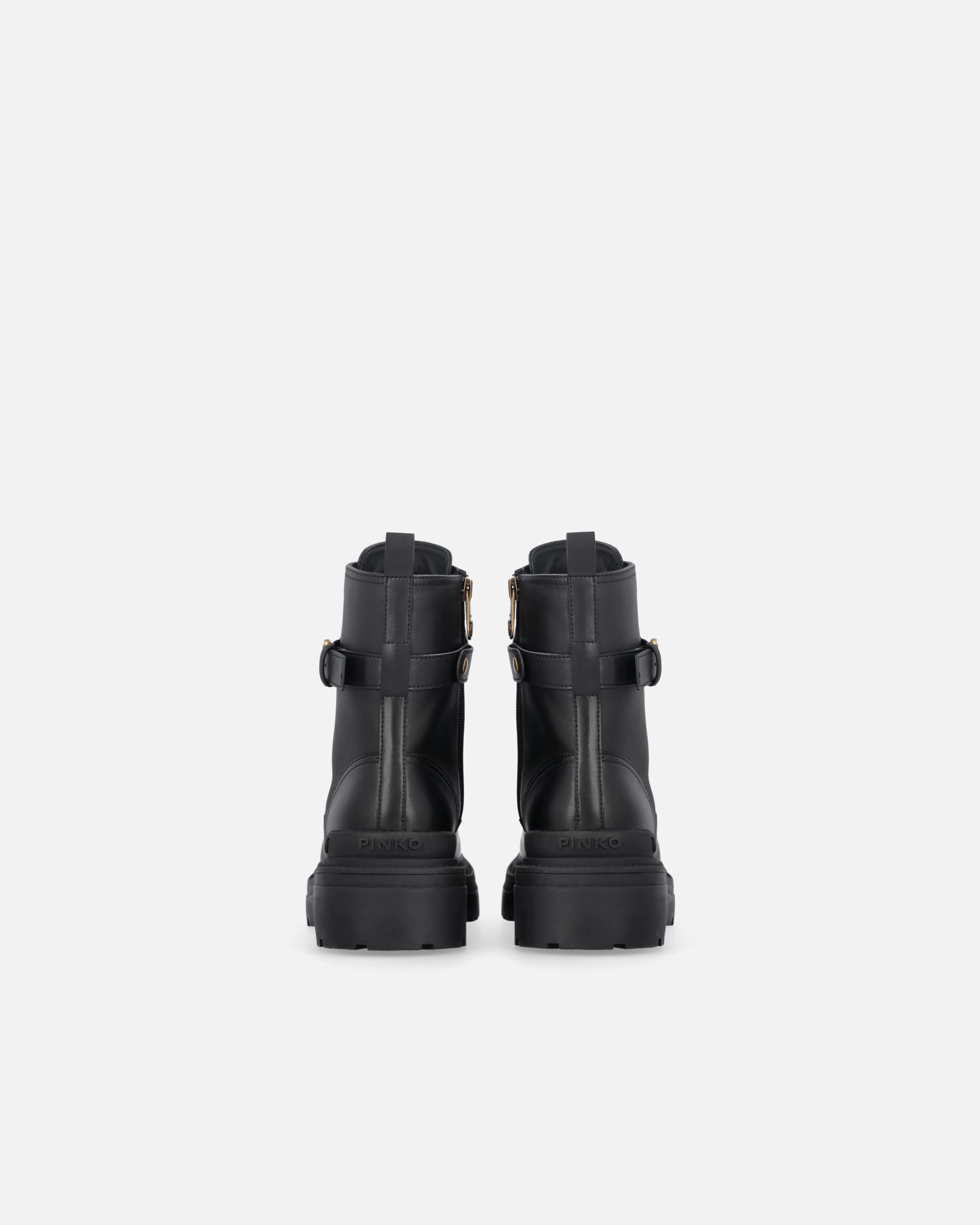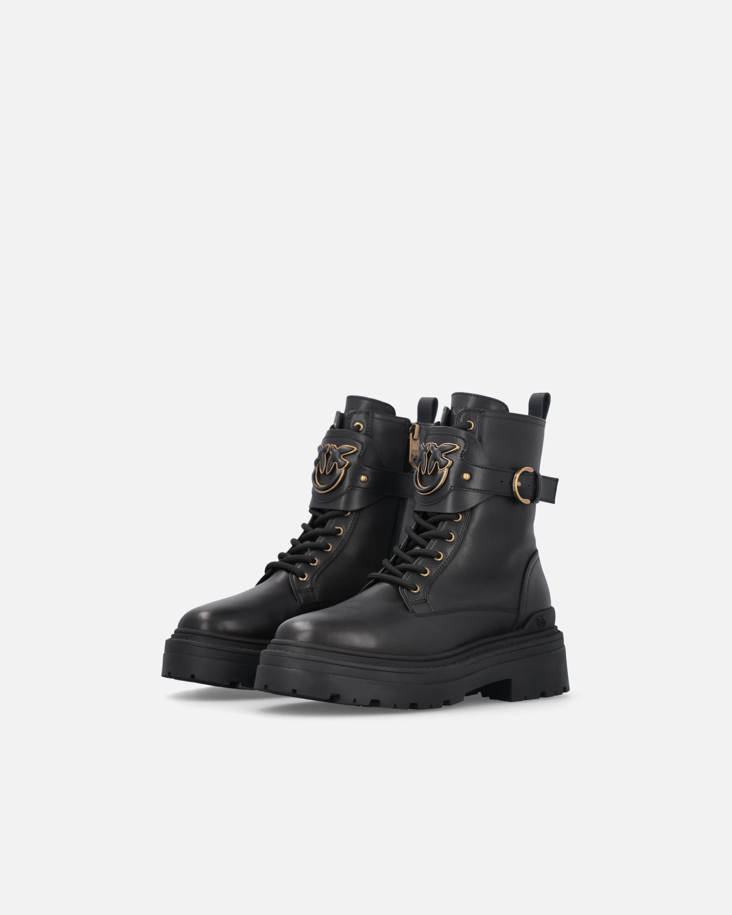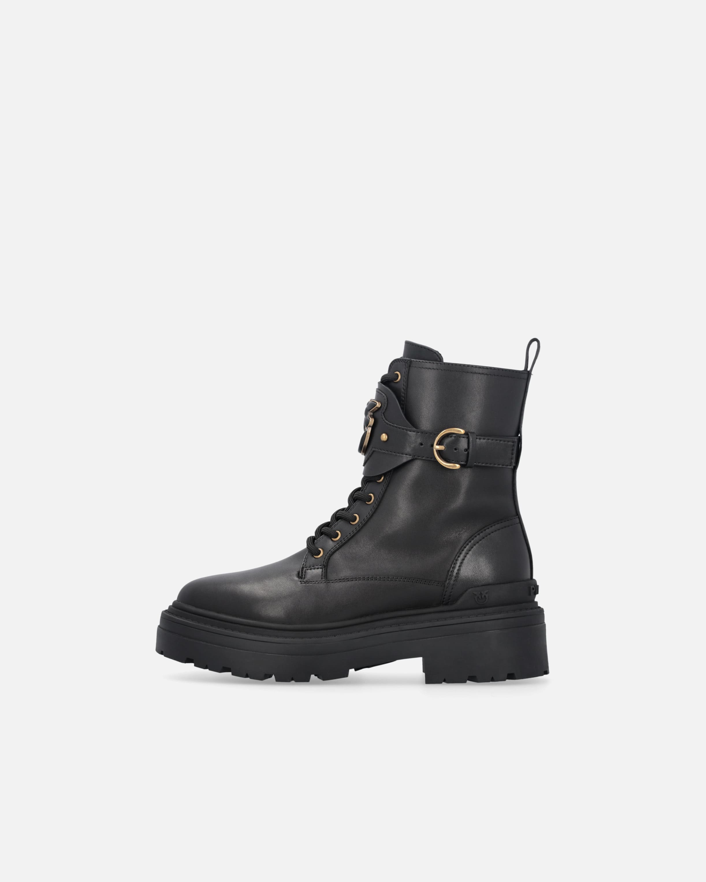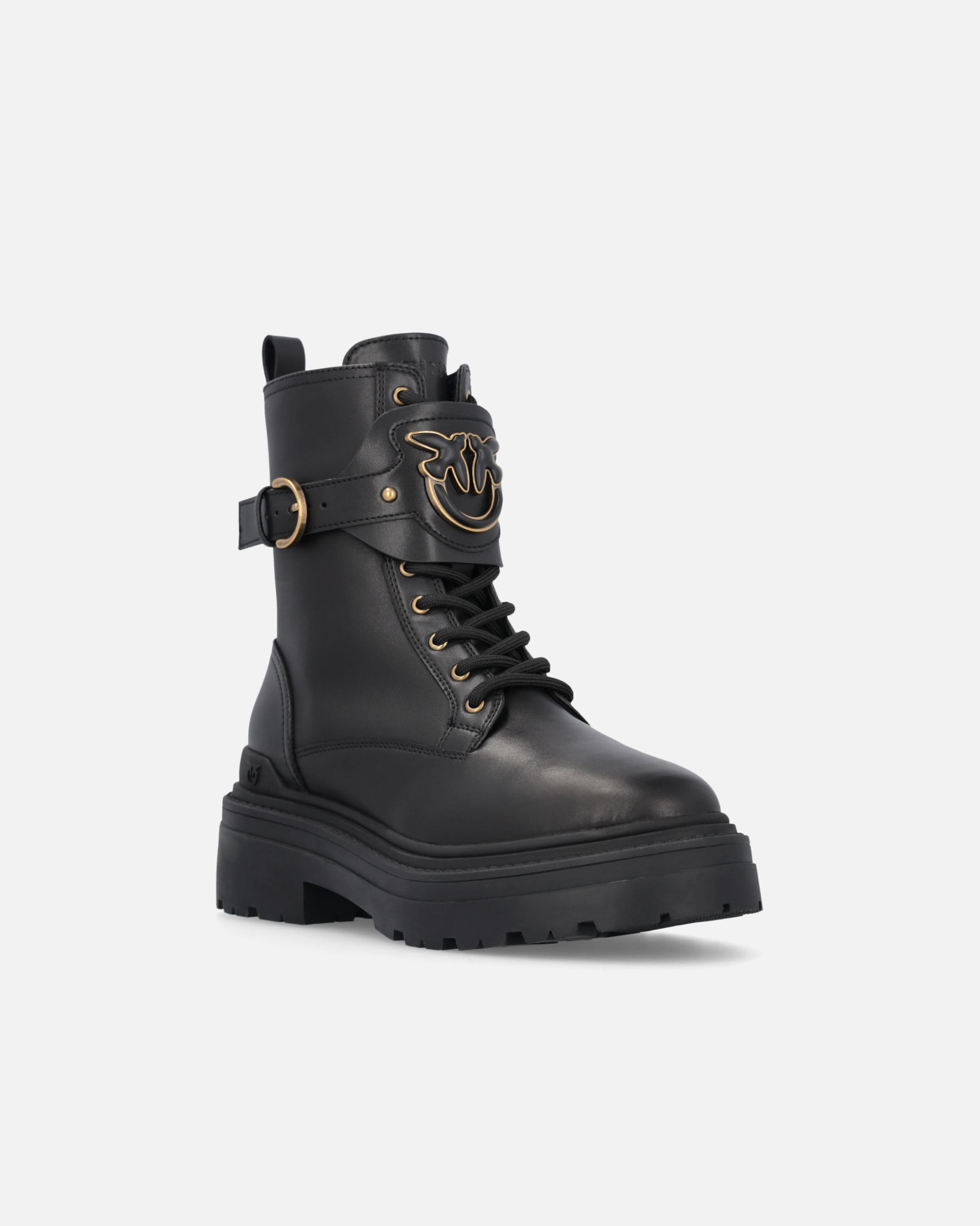 Los botines militares MIA 07 de PINKO reinventan el calzado utilitario con un toque de estilo sofisticado. Confeccionados en piel de alta calidad, estos botines de cordones se elevan hasta la pantorrilla y destacan por su correa frontal ajustable con hebilla y el icónico logotipo Love Birds en metal.