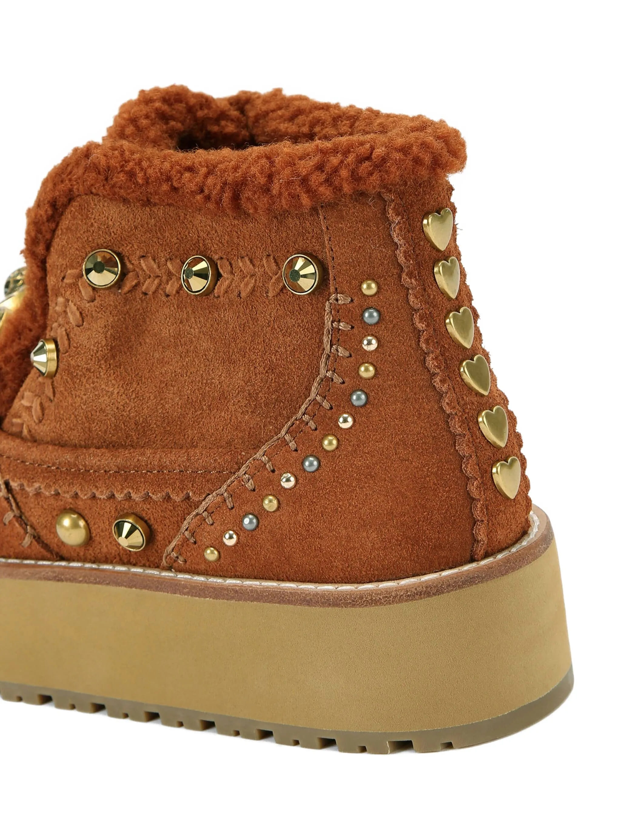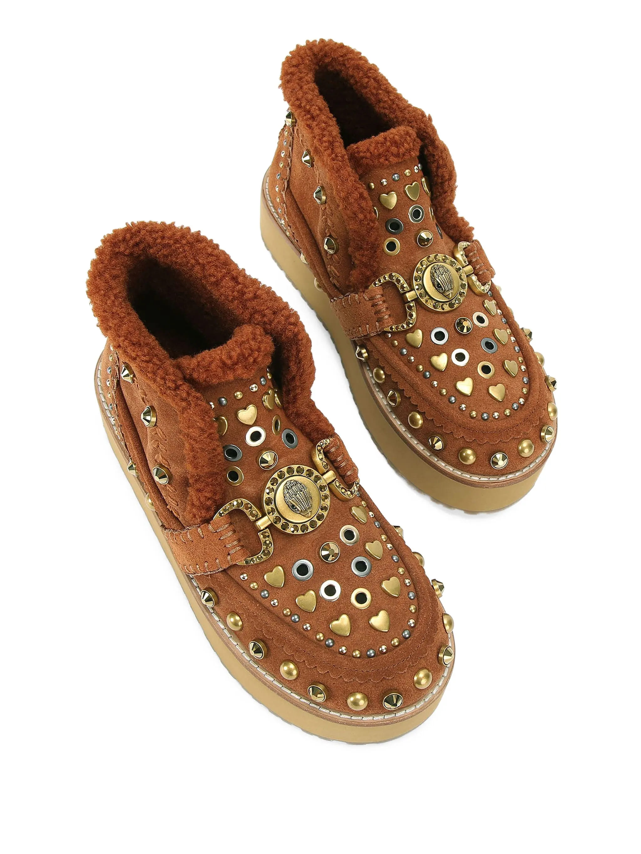 Perfectas para combinar con looks casual chic o para elevar tus conjuntos de invierno con un toque sofisticado. Detalles del producto: Color: Marrón Material exterior: 100% ante Forro: 100% otros tejidos Suela: 100% goma Apliques metálicos y tachuelas doradas Detalle decorativo con logotipo de Kurt Geiger Suela de plataforma