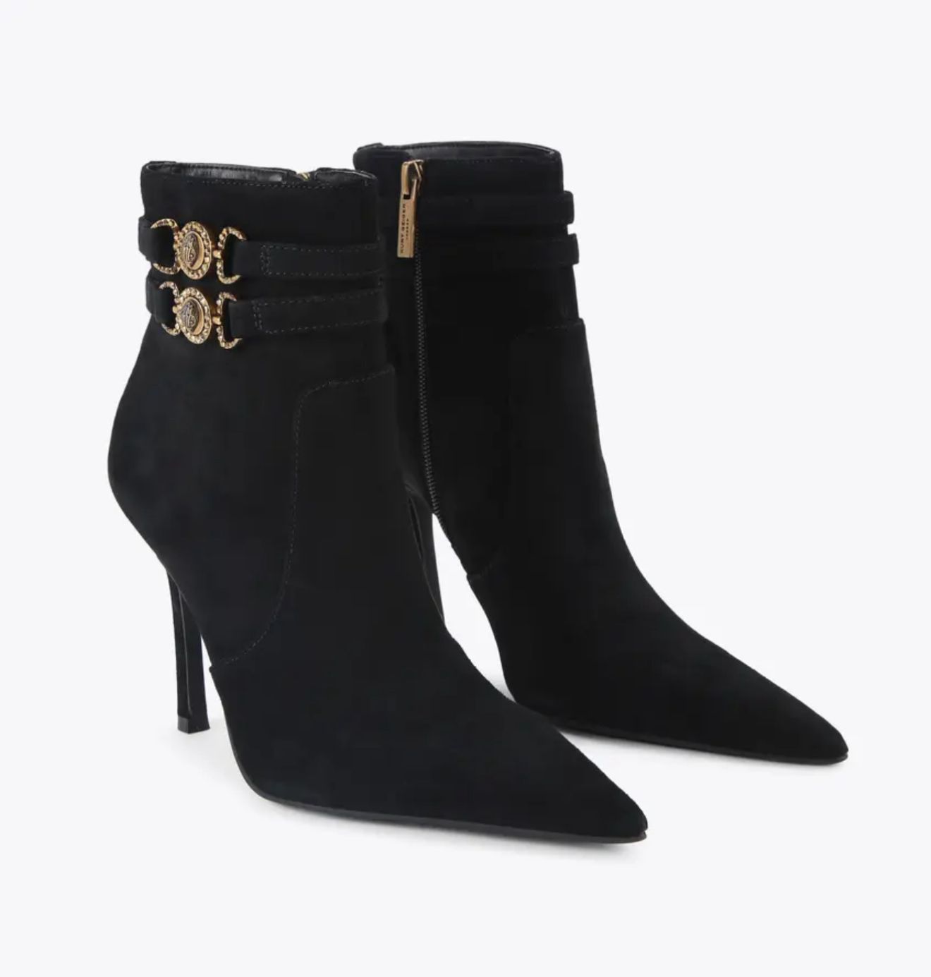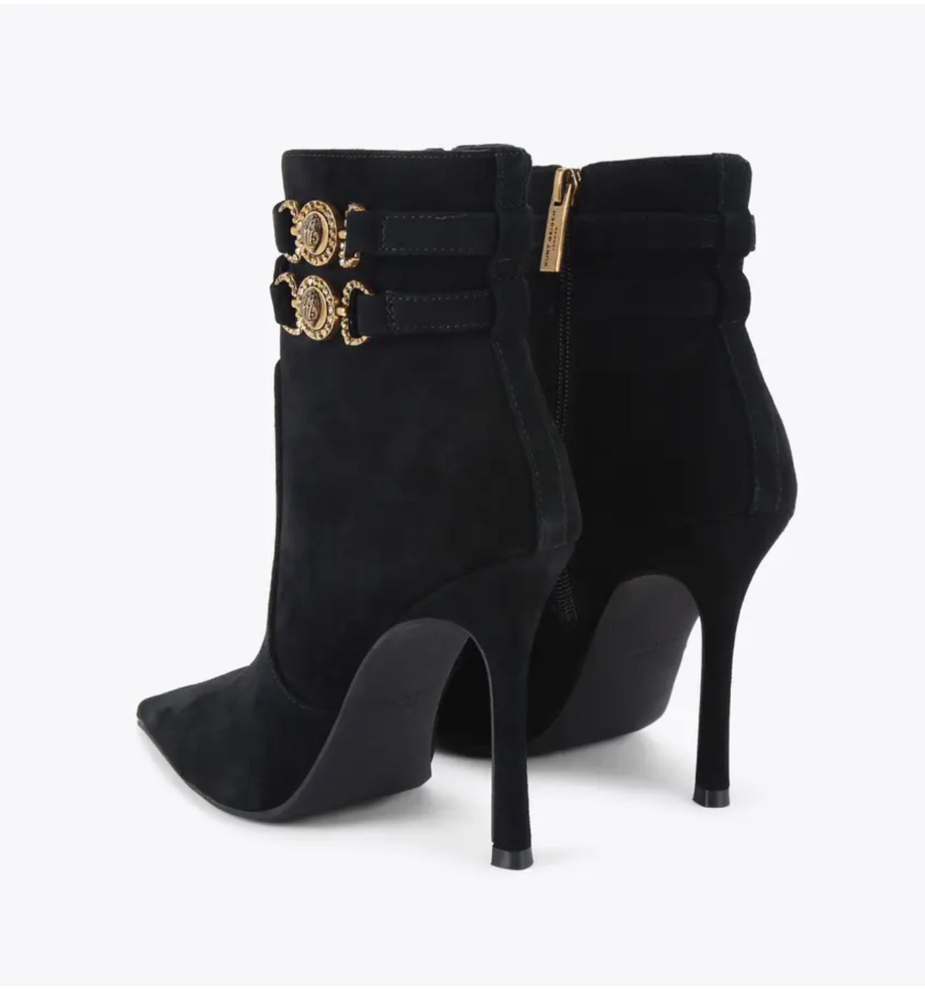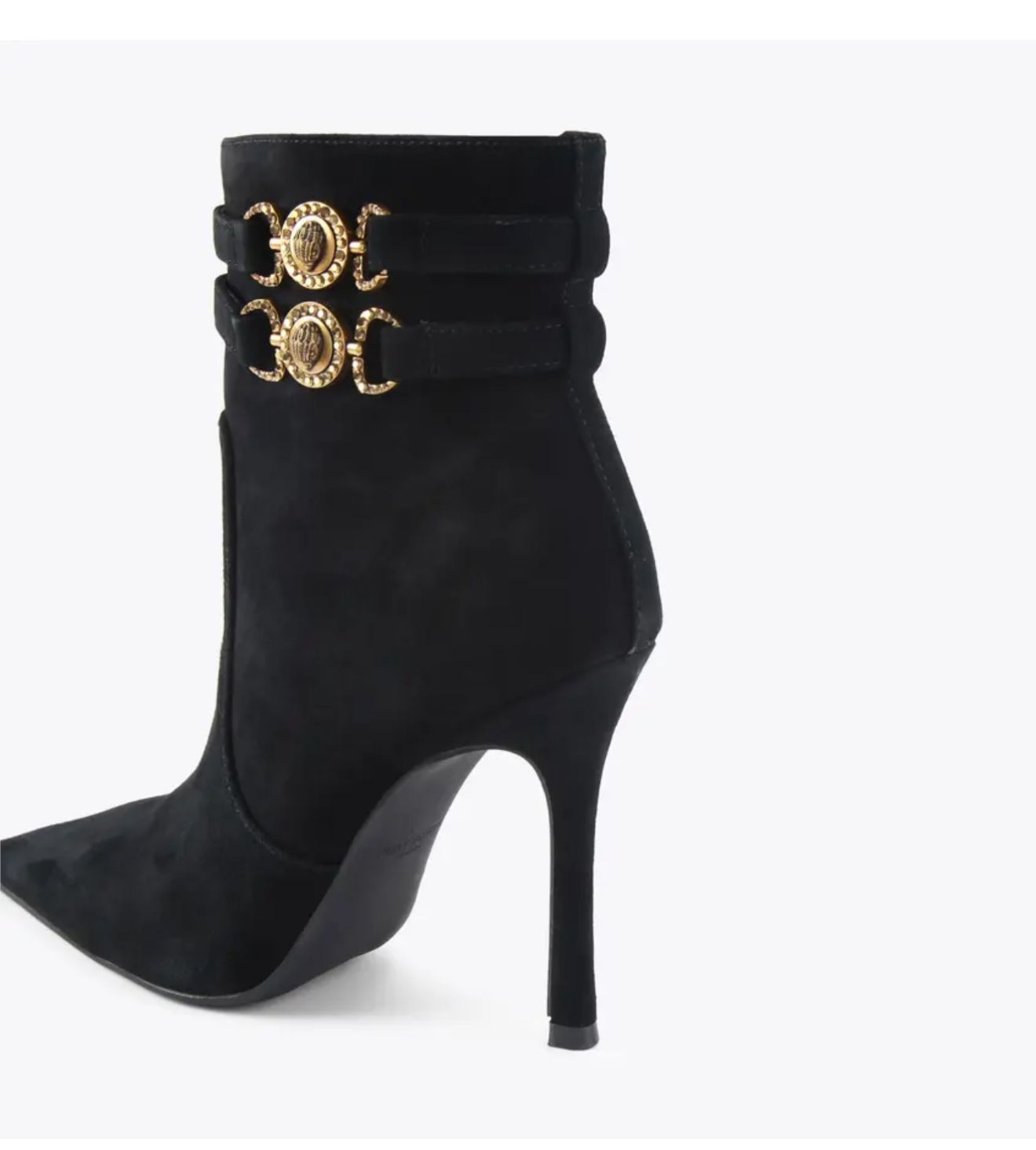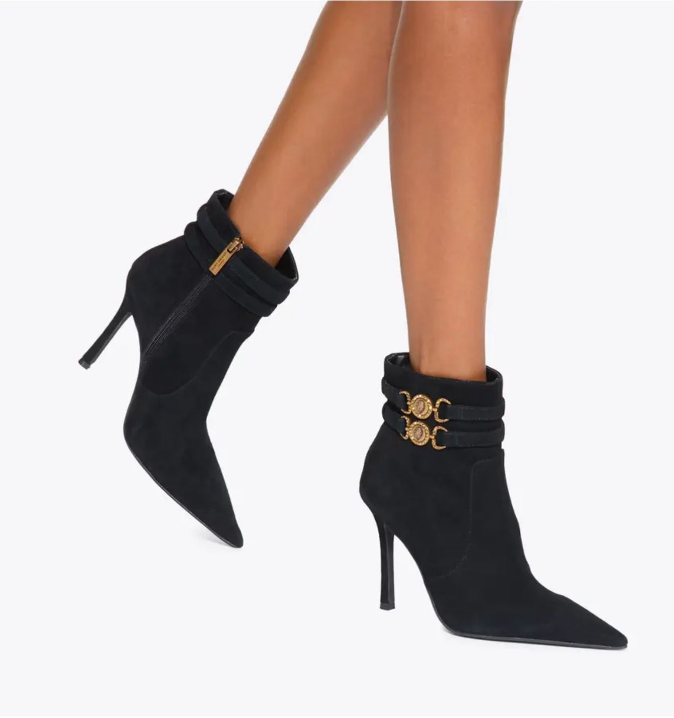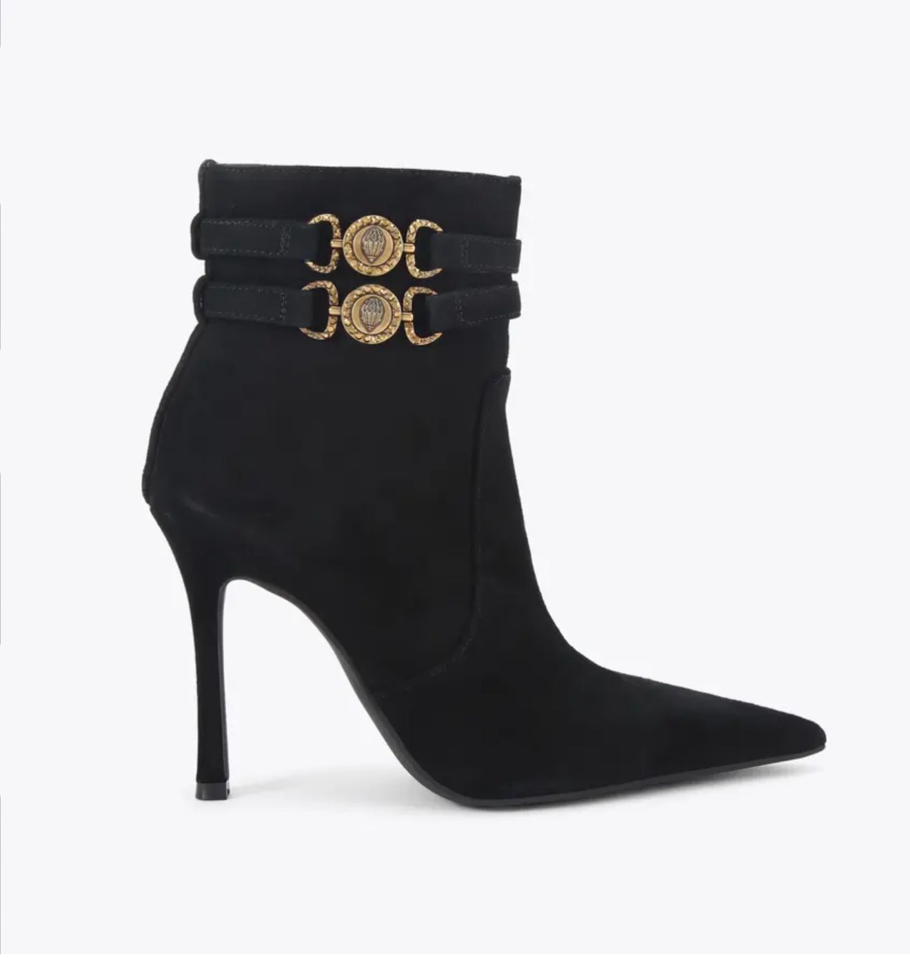Los botines negros Mansion de Kurt Geiger son la definición de elegancia y sofisticación. Confeccionados en piel de ante suave, destacan por su puntera puntiaguda y su estilizado tacón de aguja de 11 cm que estiliza la figura. El diseño se enmarca con dos tiras decorativas alrededor del tobillo, rematadas por hebillas doradas de latón envejecido con el icónico emblema de águila. Perfectos para elevar cualquier look de noche o dar un giro chic a un outfit urbano.
