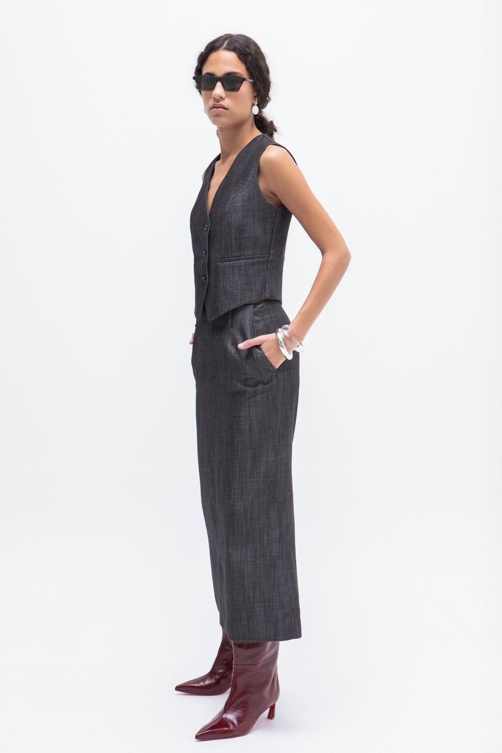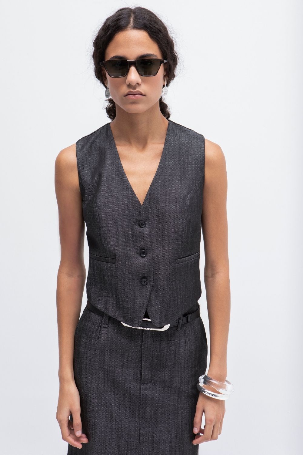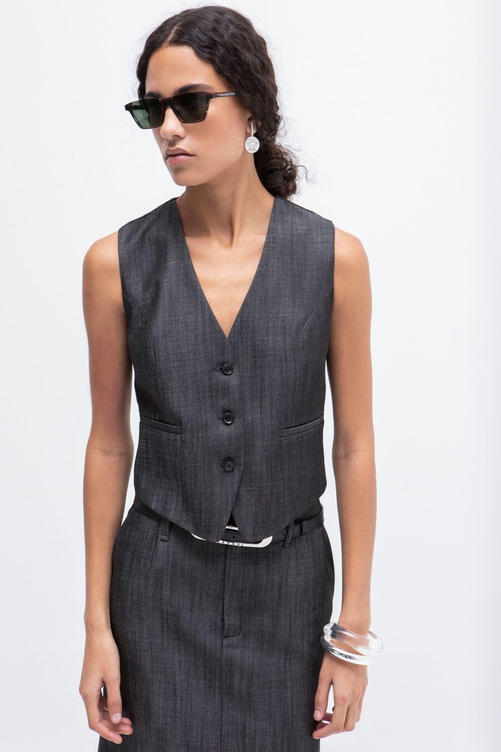 Con escote en pico y cierre frontal con tres botones, este chaleco incorpora bolsillos con vivo y está forrado en su interior para mayor confort y durabilidad. Su corte sastre actualizado lo convierte en una pieza versátil, ideal para combinar tanto con camisas como con tops más informales.