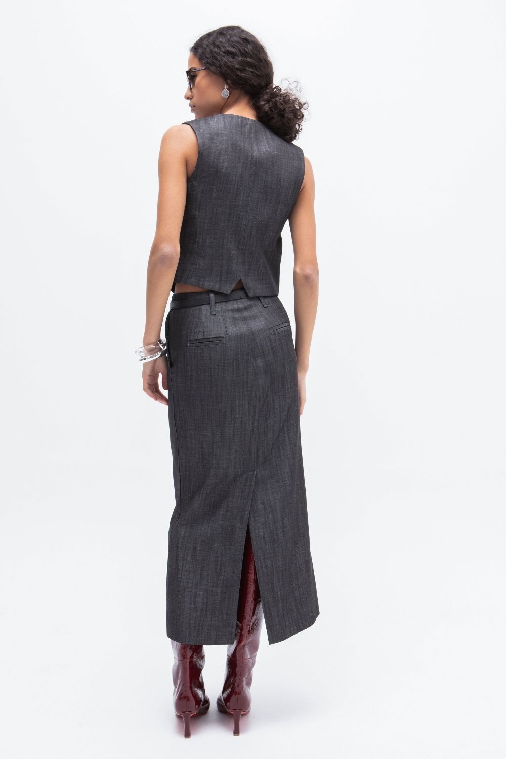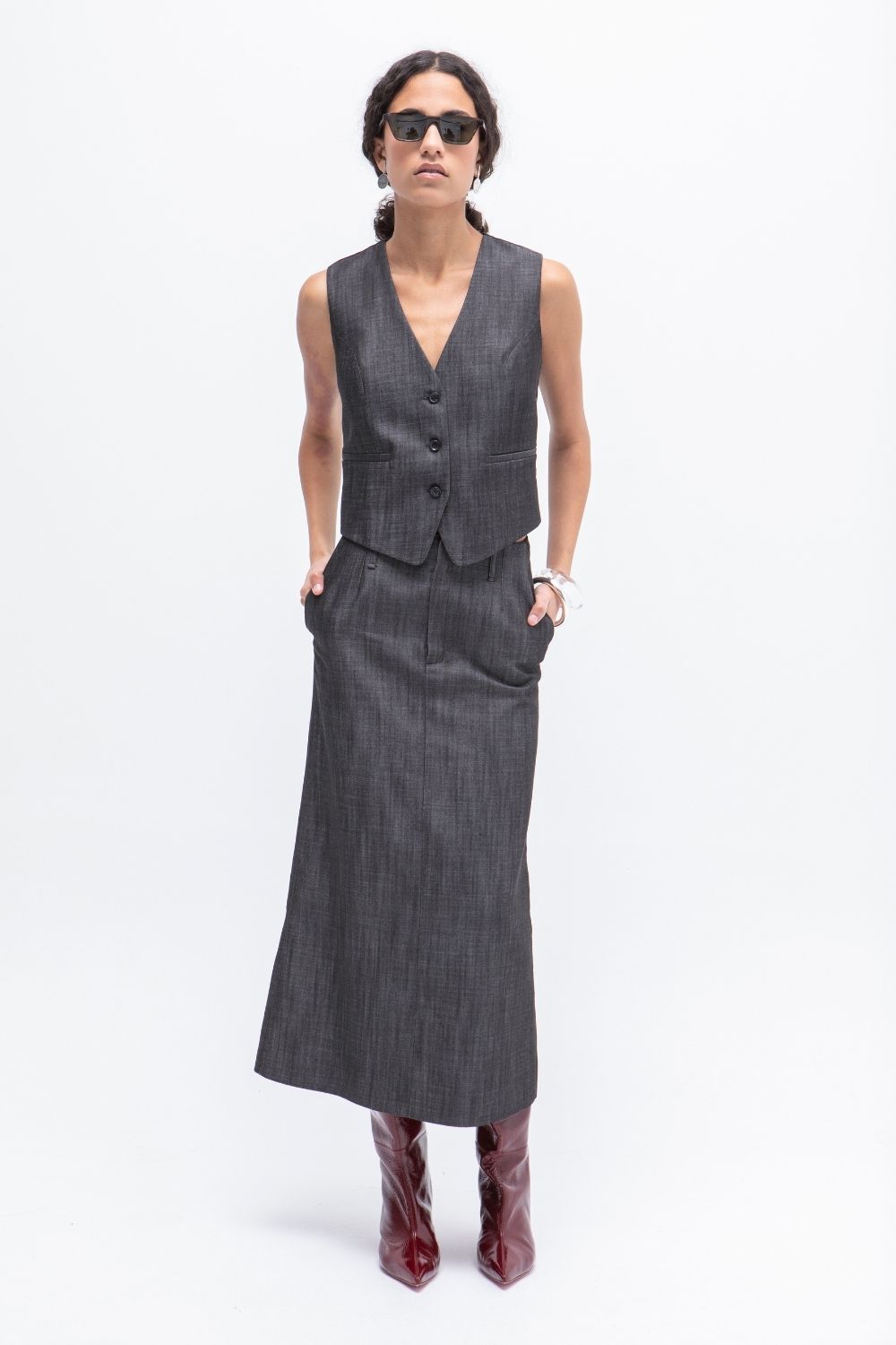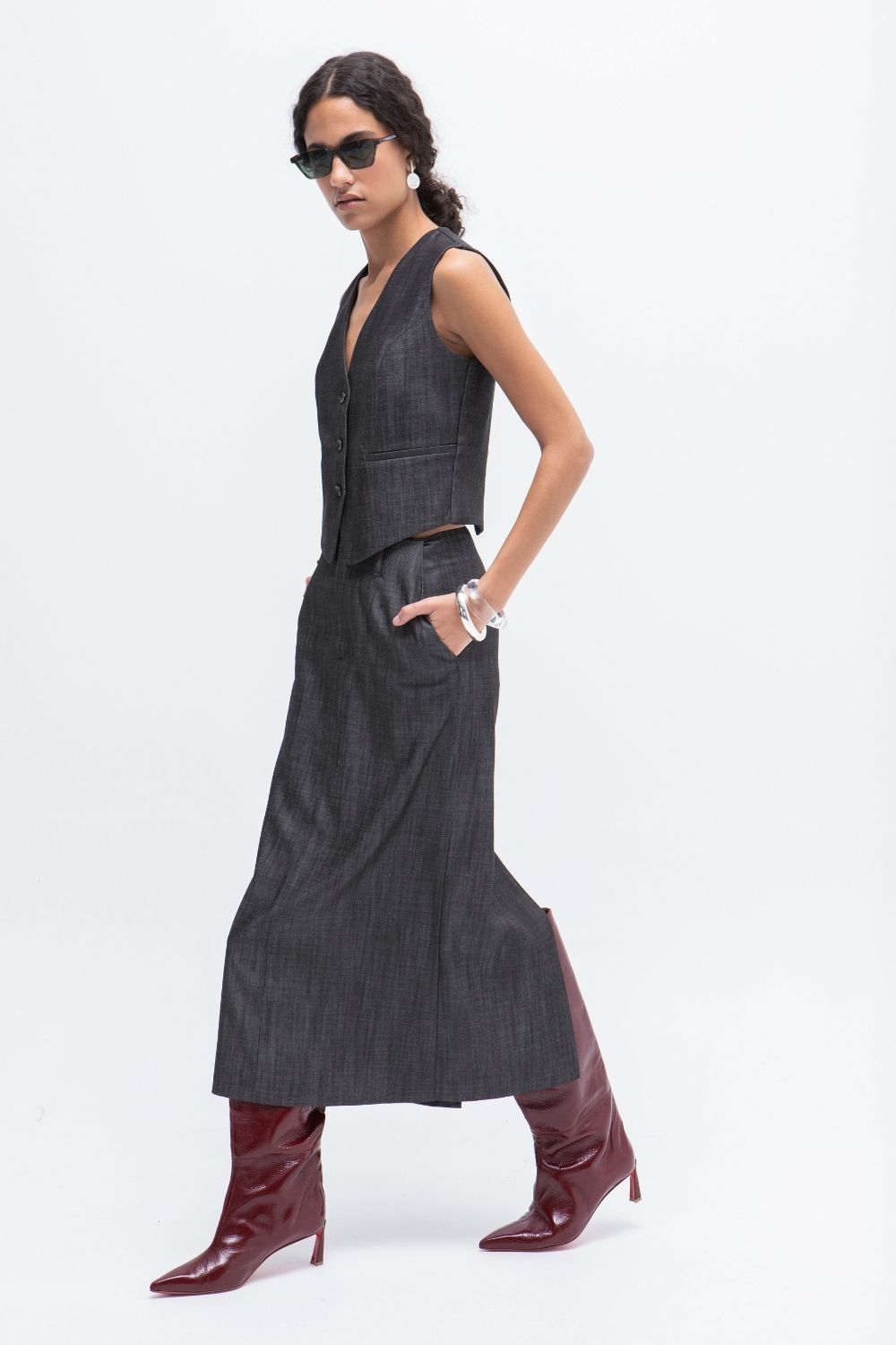 Con escote en pico y cierre frontal con tres botones, este chaleco incorpora bolsillos con vivo y está forrado en su interior para mayor confort y durabilidad. Su corte sastre actualizado lo convierte en una pieza versátil, ideal para combinar tanto con camisas como con tops más informales.