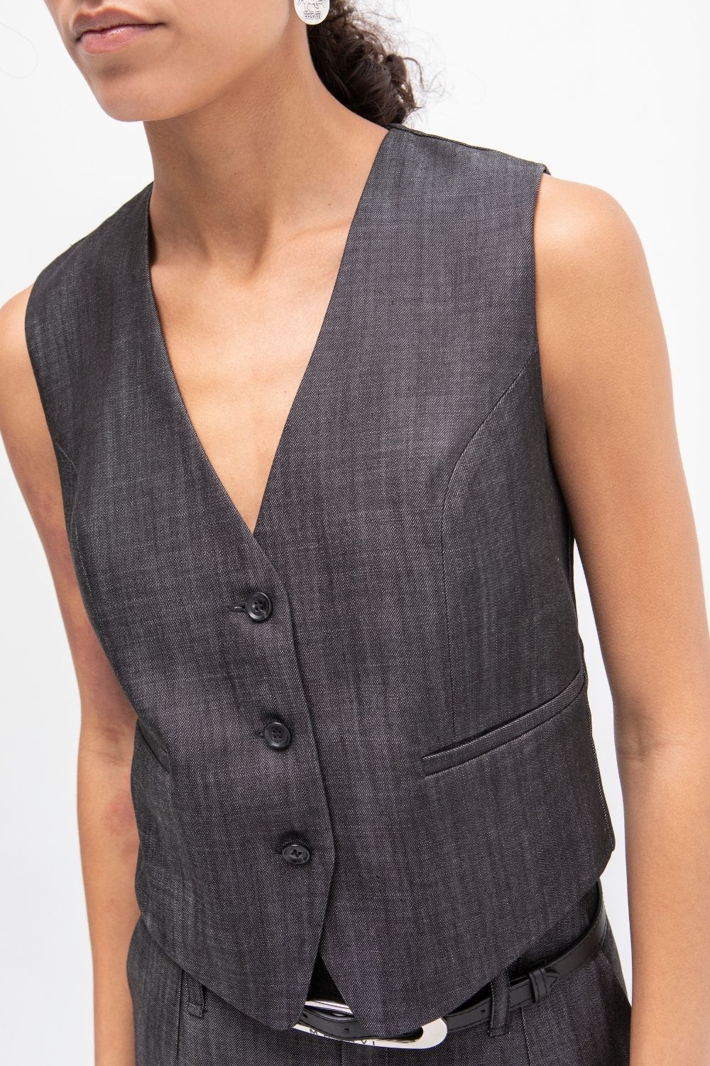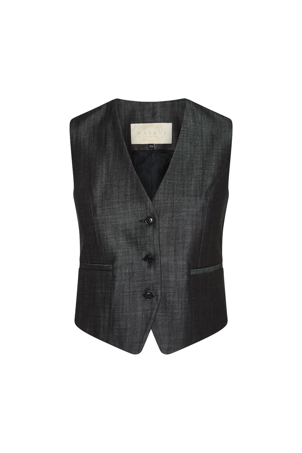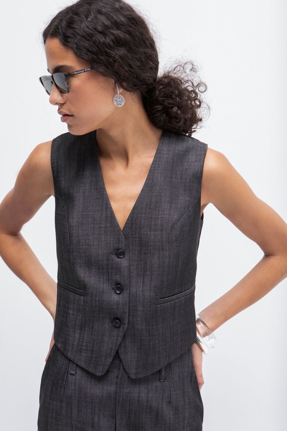 Chaleco entallado en efecto denim negro con escote en pico – masavi