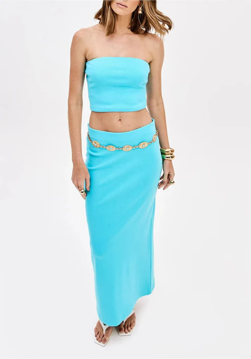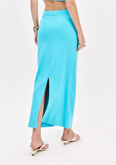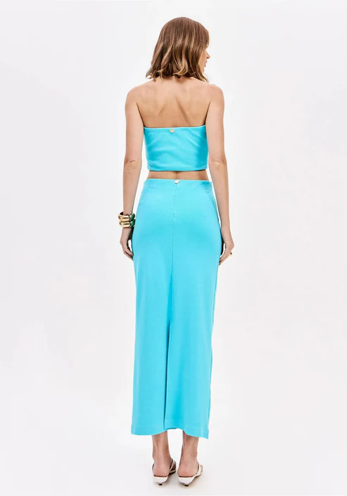 El conjunto turquesa de Lança Perfume es una propuesta elegante y moderna formada por un top palabra de honor y una falda larga de corte recto, confeccionados en tejido elástico que se adapta perfectamente a la silueta.