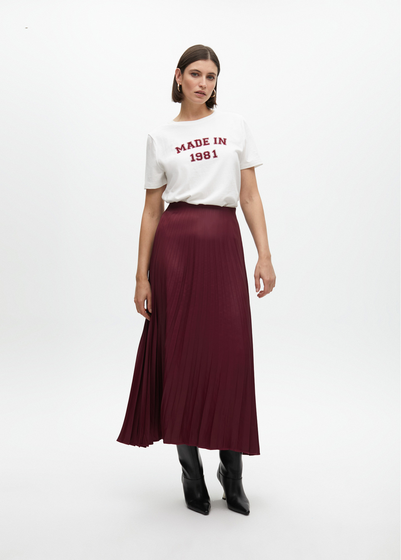 Añade un toque de distinción a tu armario con esta falda plisada larga de lola casademunt de acabado encerado en tono burdeo, perfecta para elevar cualquier look con elegancia. Confeccionada en un tejido suave y fluido, su movimiento natural aporta ligereza y sofisticación a cada paso.
