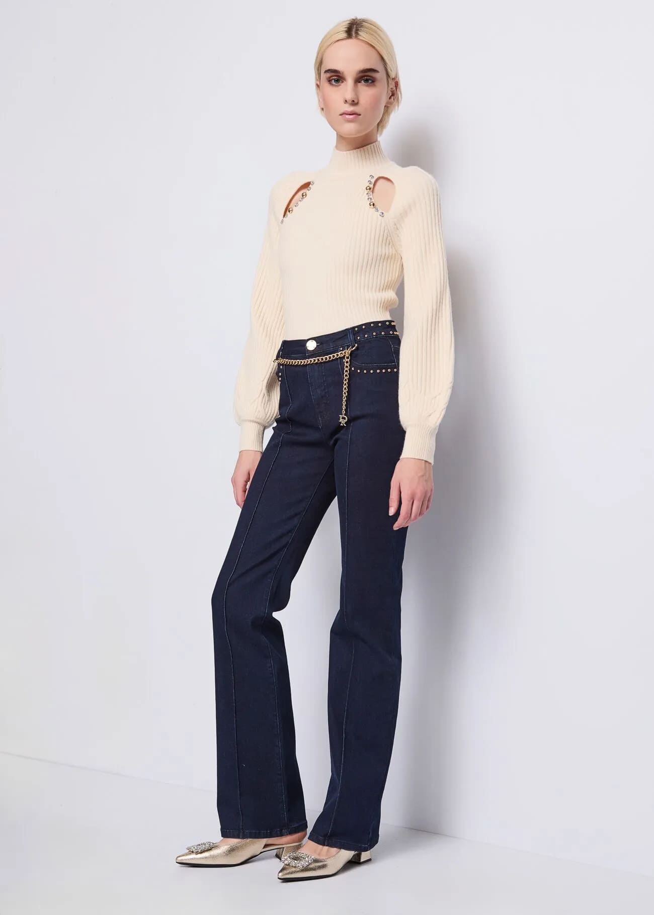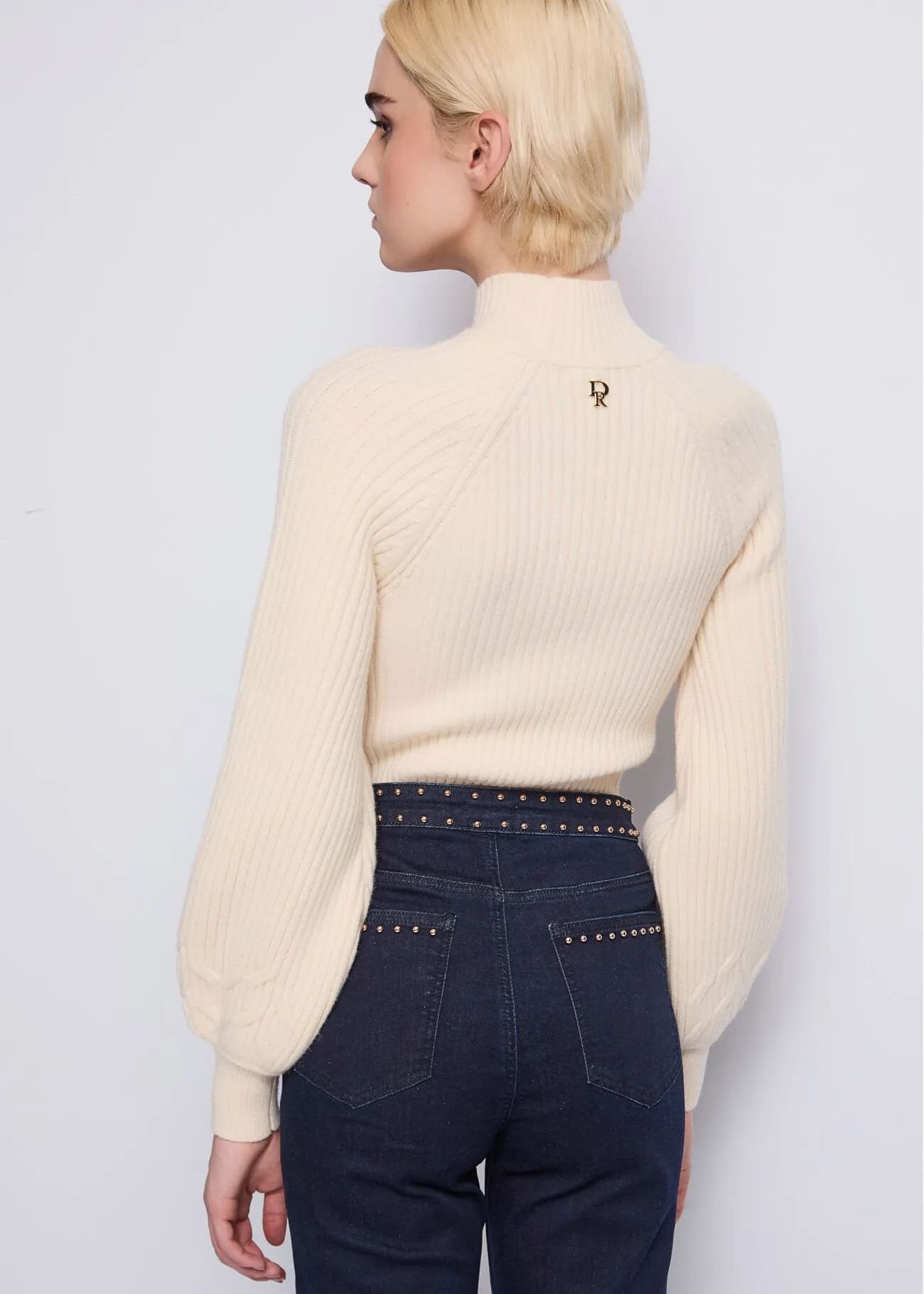Confeccionado en una mezcla cálida y suave de acrílico, poliéster, poliamida y lana, presenta un diseño recortado con aplicaciones de tachuelas y pedrería, que aportan luz y carácter al conjunto. El cuello alto y las mangas largas refuerzan el diseño invernal, mientras que el logotipo metálico DR en la espalda sella el diseño con un toque de exclusividad.