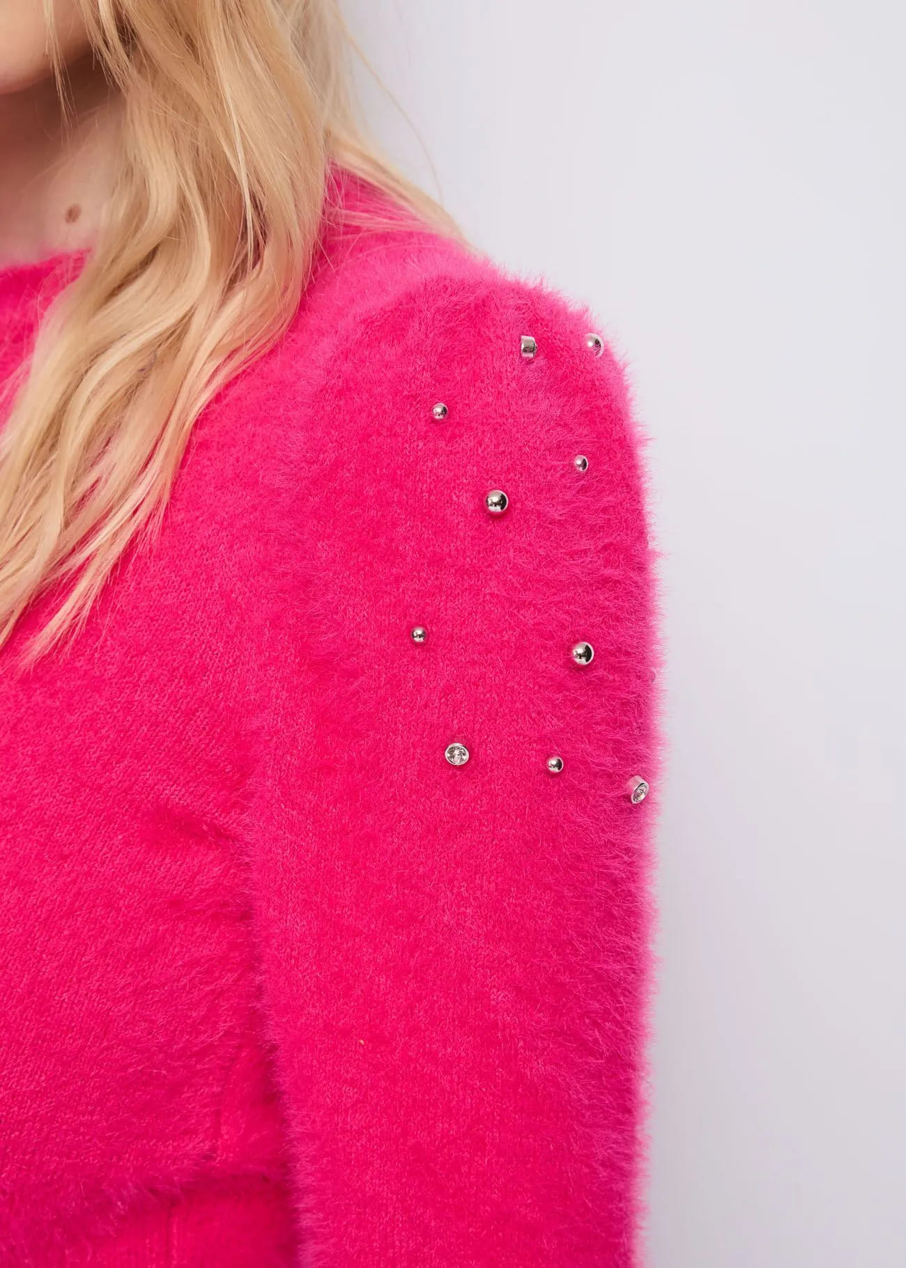 El diseño incorpora apliques de pedrería y tachuelas en la parte superior, creando un contraste brillante que eleva cualquier look. Su cuello redondo clásico, mangas largas y el adorno de pedrería en el bajo completan un diseño que combina comodidad y sofisticación.