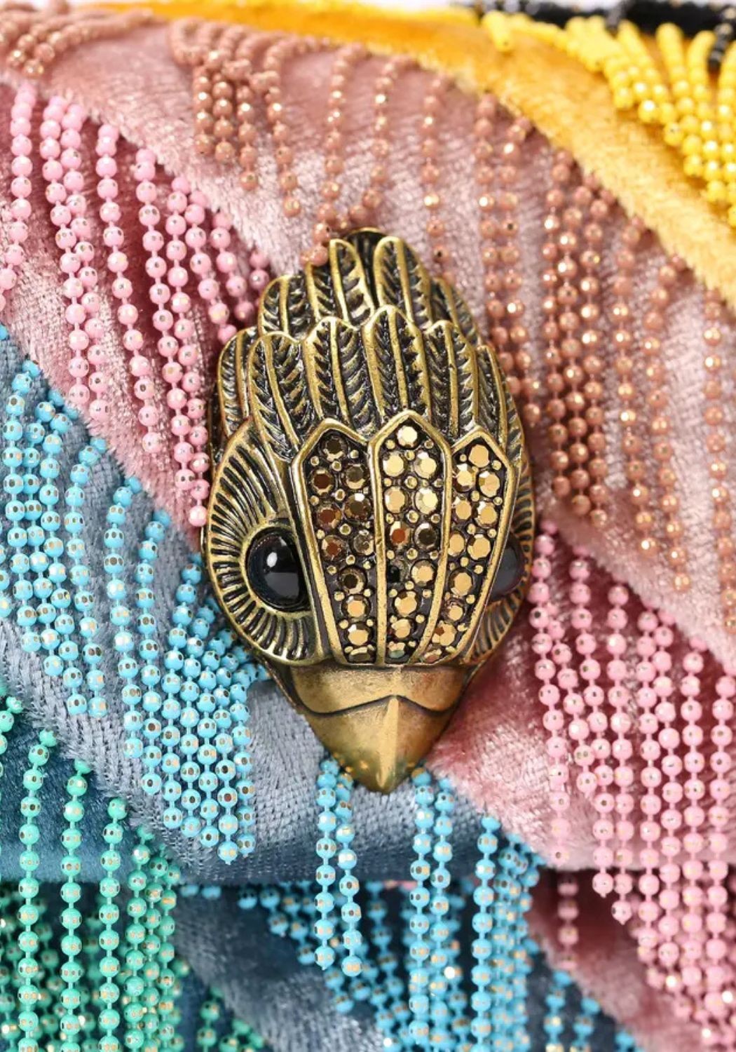 Mini Bolso Kurt Geiger Kensington Fringes Multicolor en Terciopelo Deslumbra con el Mini Kensington Fringes de Kurt Geiger London, un bolso de diseño exclusivo que fusiona lujo y originalidad. Confeccionado en terciopelo multicolor con flecos de cuentas dispuestas en patrón diagonal, esta pieza destaca por su textura, color y movimiento. Incorpora una cadena metálica dorada que puede usarse al hombro o cruzada, y el icónico cierre en forma de cabeza de águila con incrustaciones brillantes. El reverso en terciopelo verde esmeralda y el interior compacto lo hacen perfecto tanto para eventos como para elevar looks casuales. Una declaración de estilo hecha accesorio. Dimensiones aproximadas: