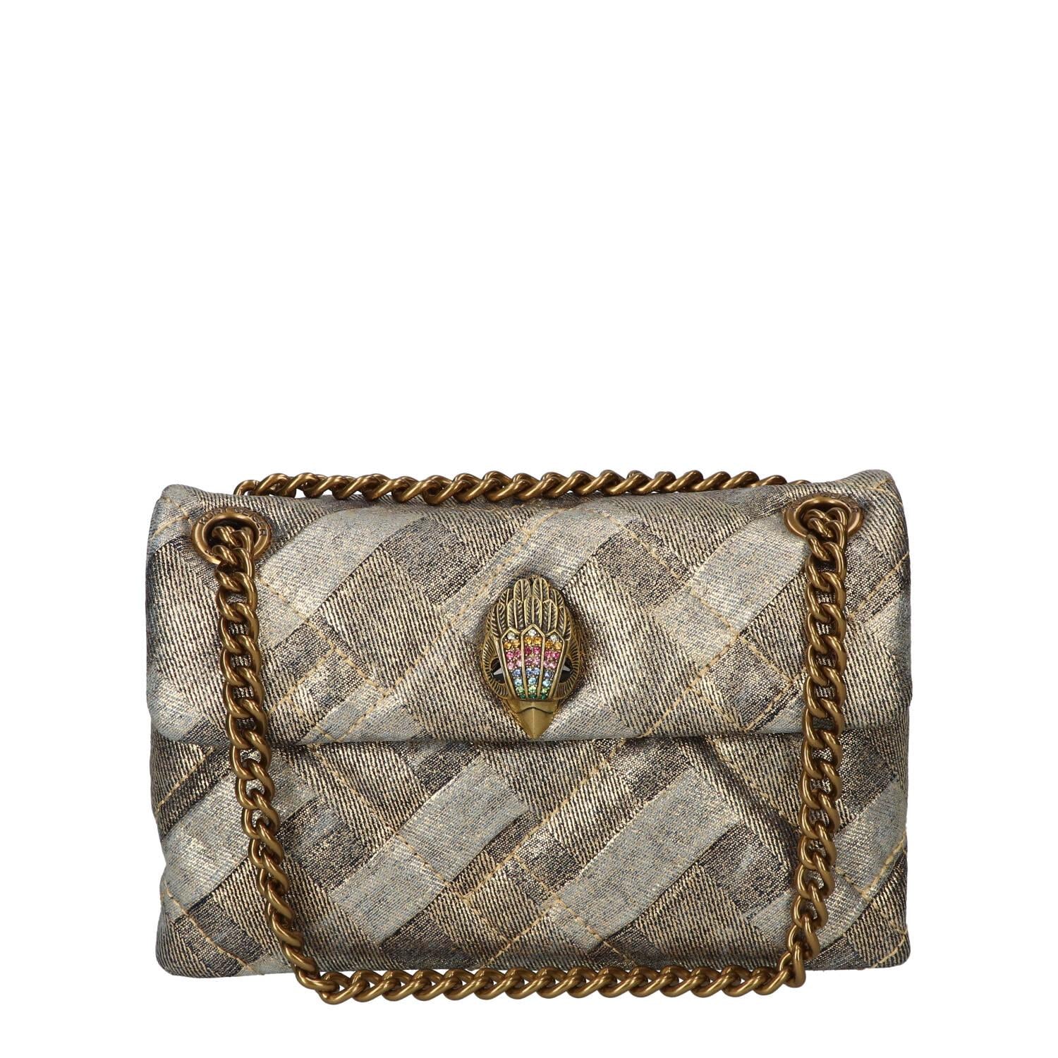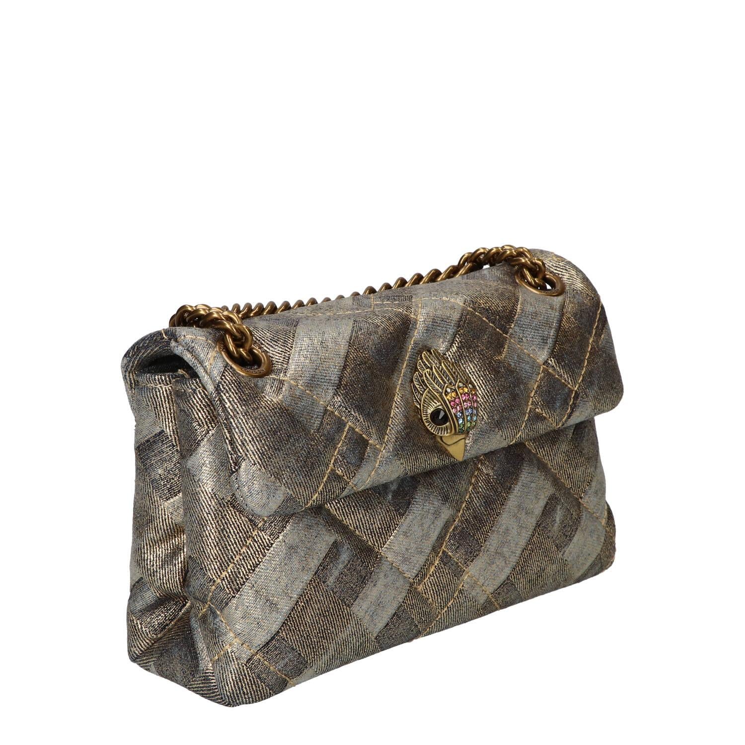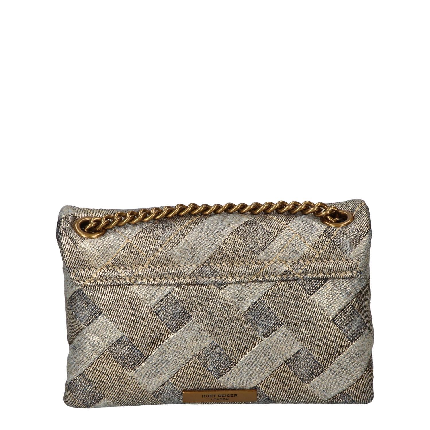 Este mini bolso tejano dorado satinado de Kurt Geiger combina un diseño elegante con un acabado brillante que lo hace destacar en cualquier ocasión. Confeccionado en tejido tipo denim con efecto metalizado, cuenta con un patrón de espiga entrelazada en tonos dorados y plateados. El icónico cierre frontal de águila con cristales multicolor le da ese toque distintivo y sofisticado que caracteriza a la marca. La cadena metálica en tono oro envejecido permite llevarlo al hombro o como bolso cruzado. Ideal para elevar cualquier look de noche o eventos especiales. Espacioso para su tamaño compacto, cabe tu móvil, llaves y lo esencial. Un accesorio llamativo, versátil y con carácter.  Medidas aproximadas: