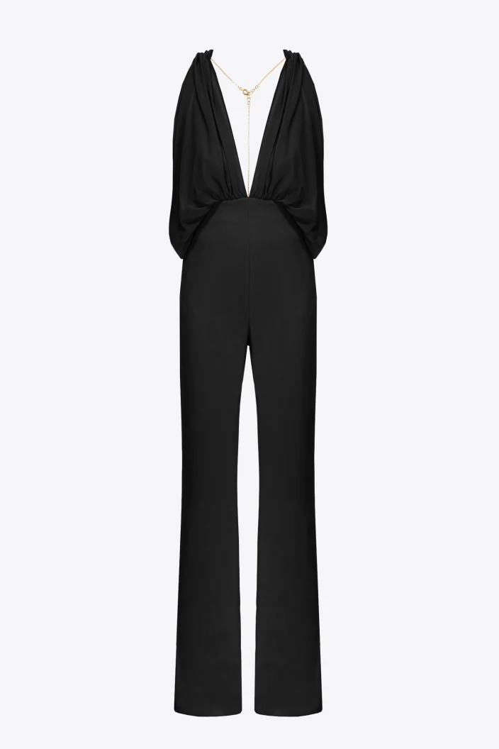 Mono largo de tejido interlock crepé de viscosa caracterizado por el pronunciado escote, tanto delante como detrás, corpiño y mangas de efecto drapeado unidas por la cadenita de metal en la espalda con un pequeño mosquetón. Pantalones con corte alto en la cintura, pernera de línea ceñida y acampanada en el bajo.