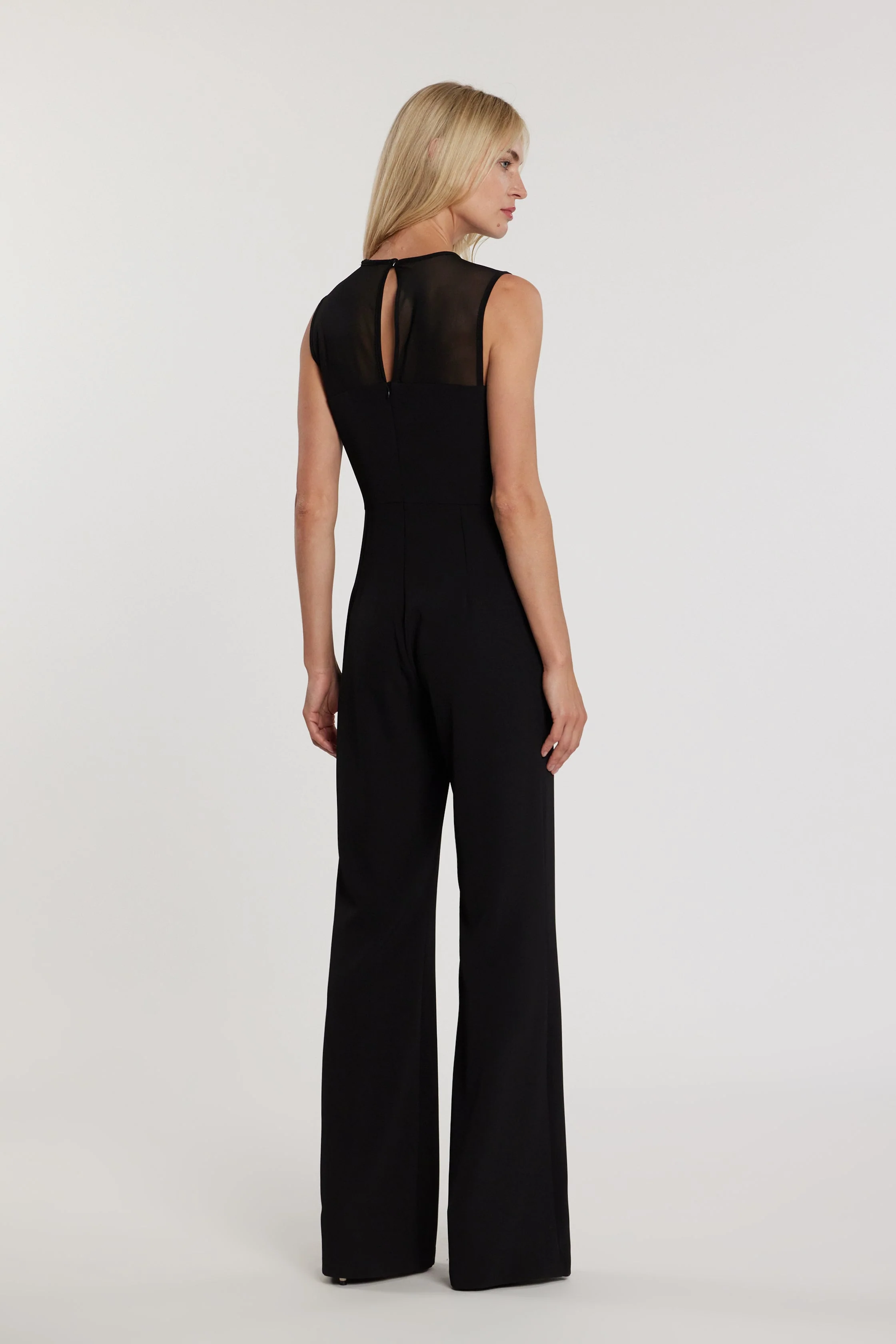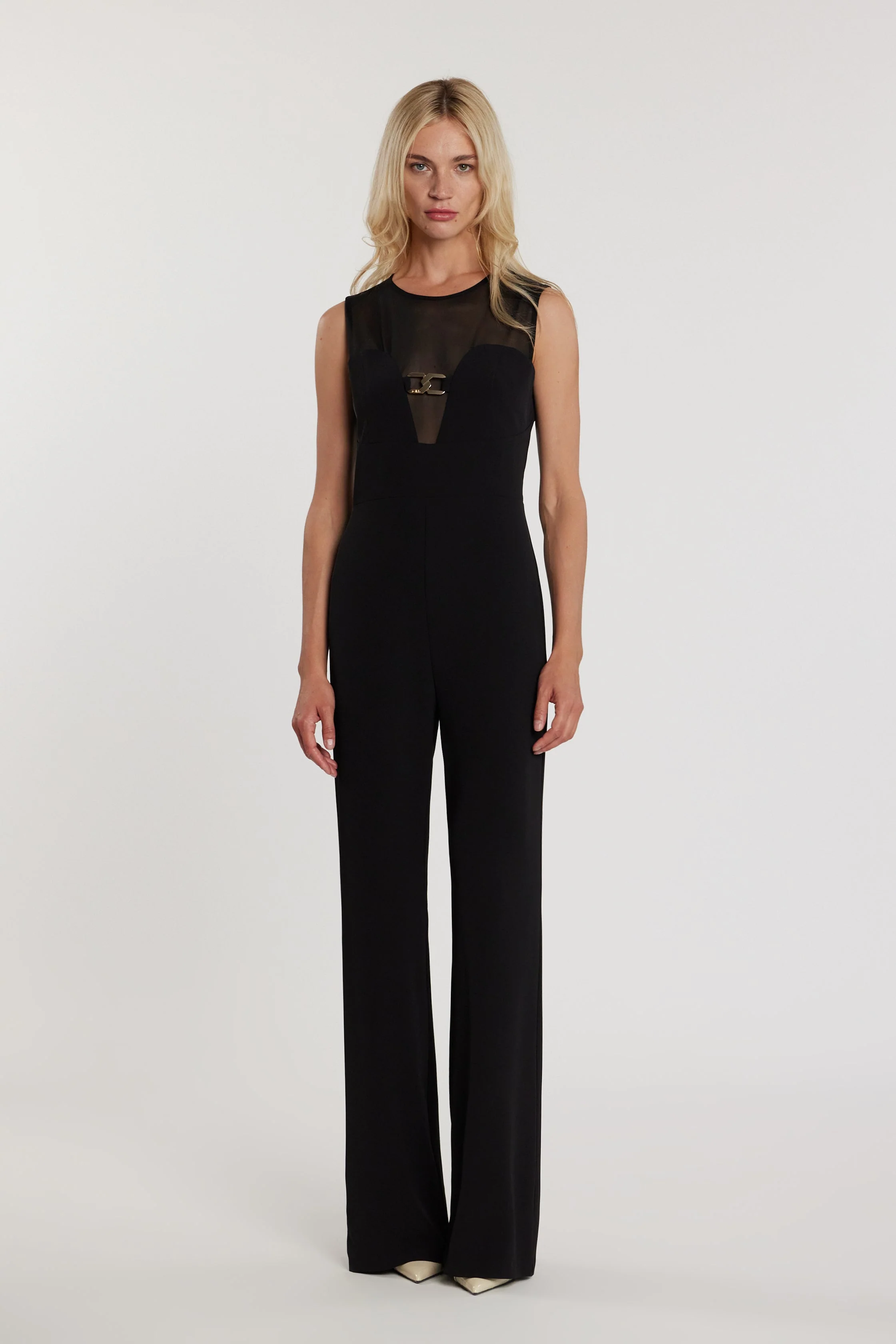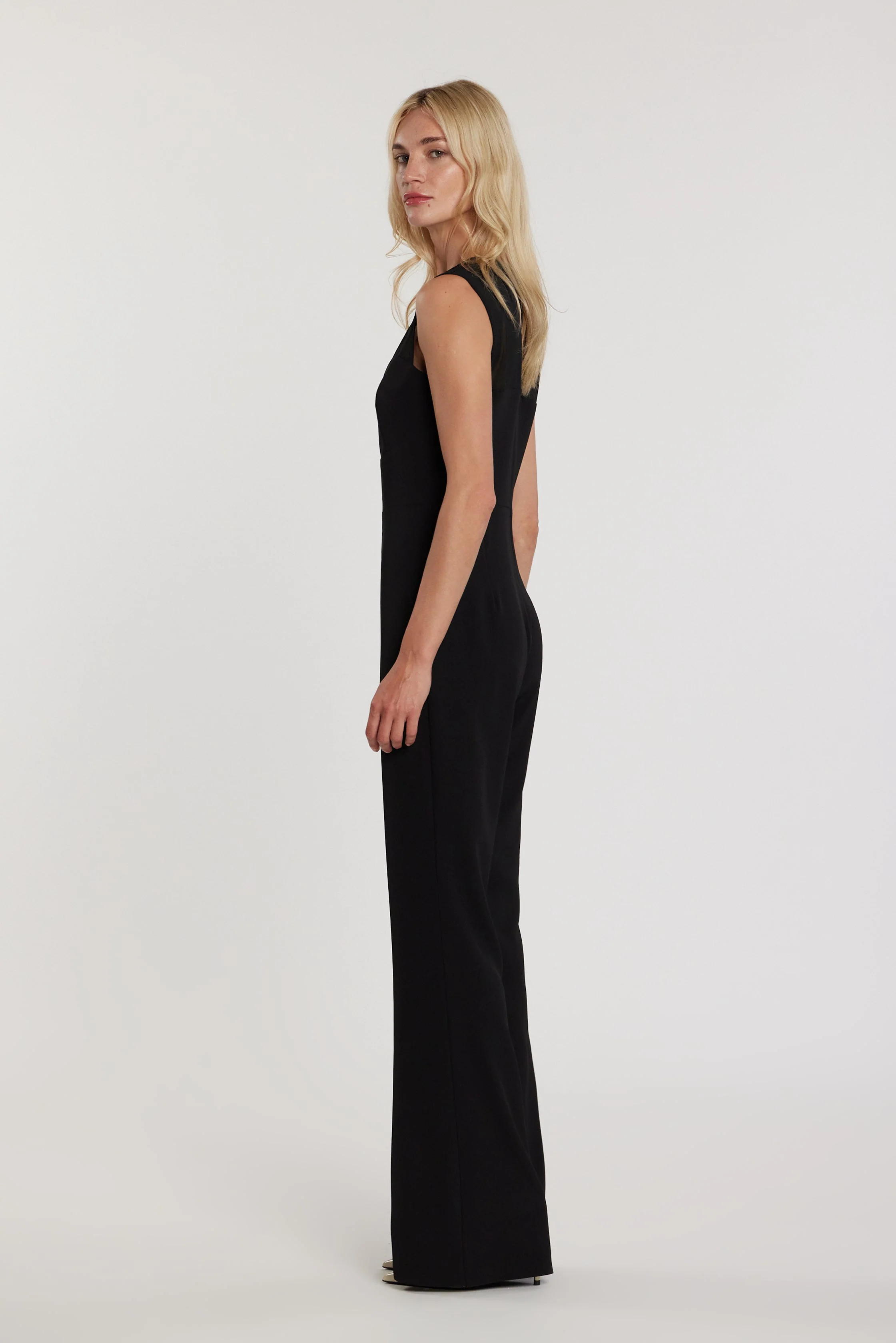 El mono largo MORANTE sin mangas combina elegancia y carácter en un diseño de inspiración sastre. Su efecto americana cruzada de doble botonadura aporta estructura y sofisticación, mientras que el pantalón palazzo fluido estiliza y alarga la silueta.