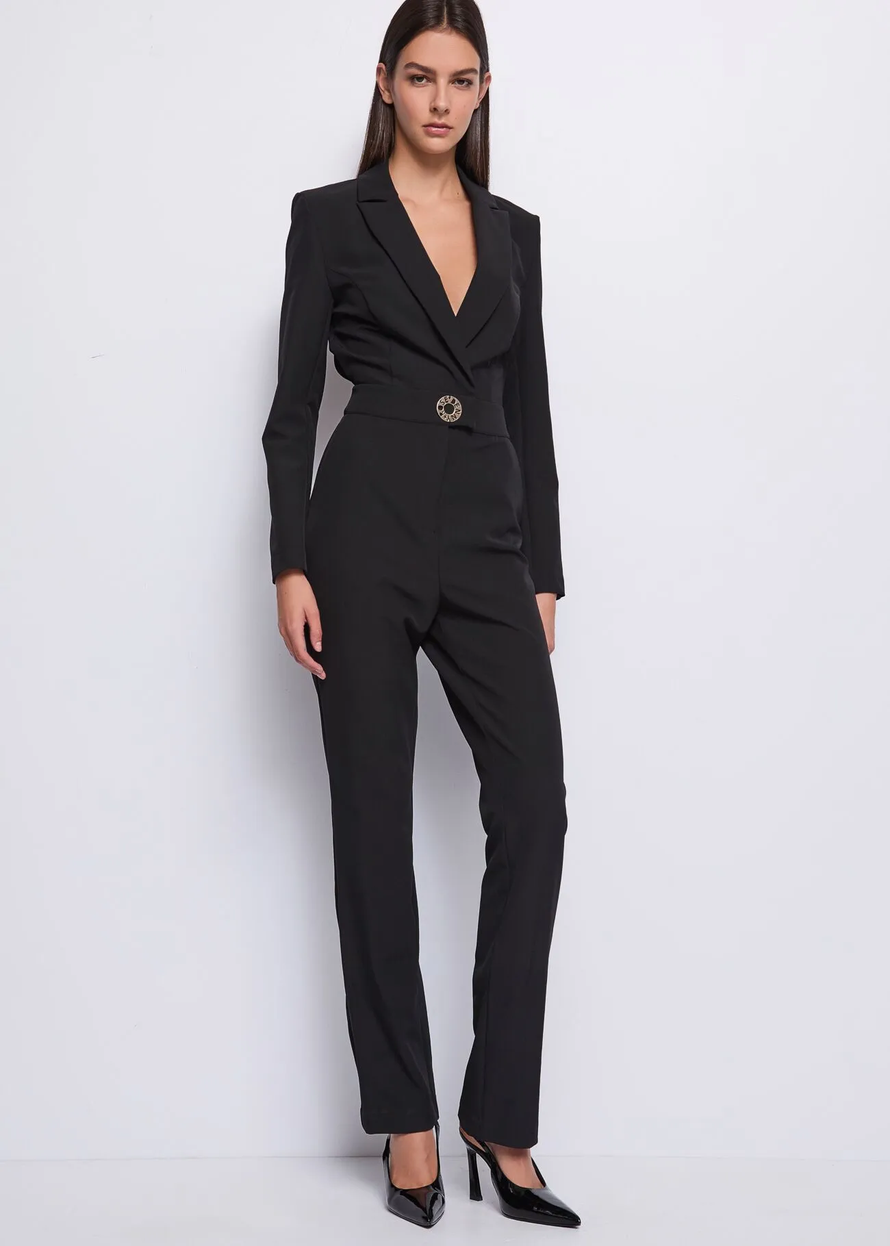En la cintura, una hebilla con el logo metálico de Denny Rose actúa como punto focal, marcando la figura y añadiendo un guiño de branding sofisticado. Este mono es ideal para ocasiones especiales, cenas, eventos de noche o incluso una fiesta donde el estilo sea protagonista.