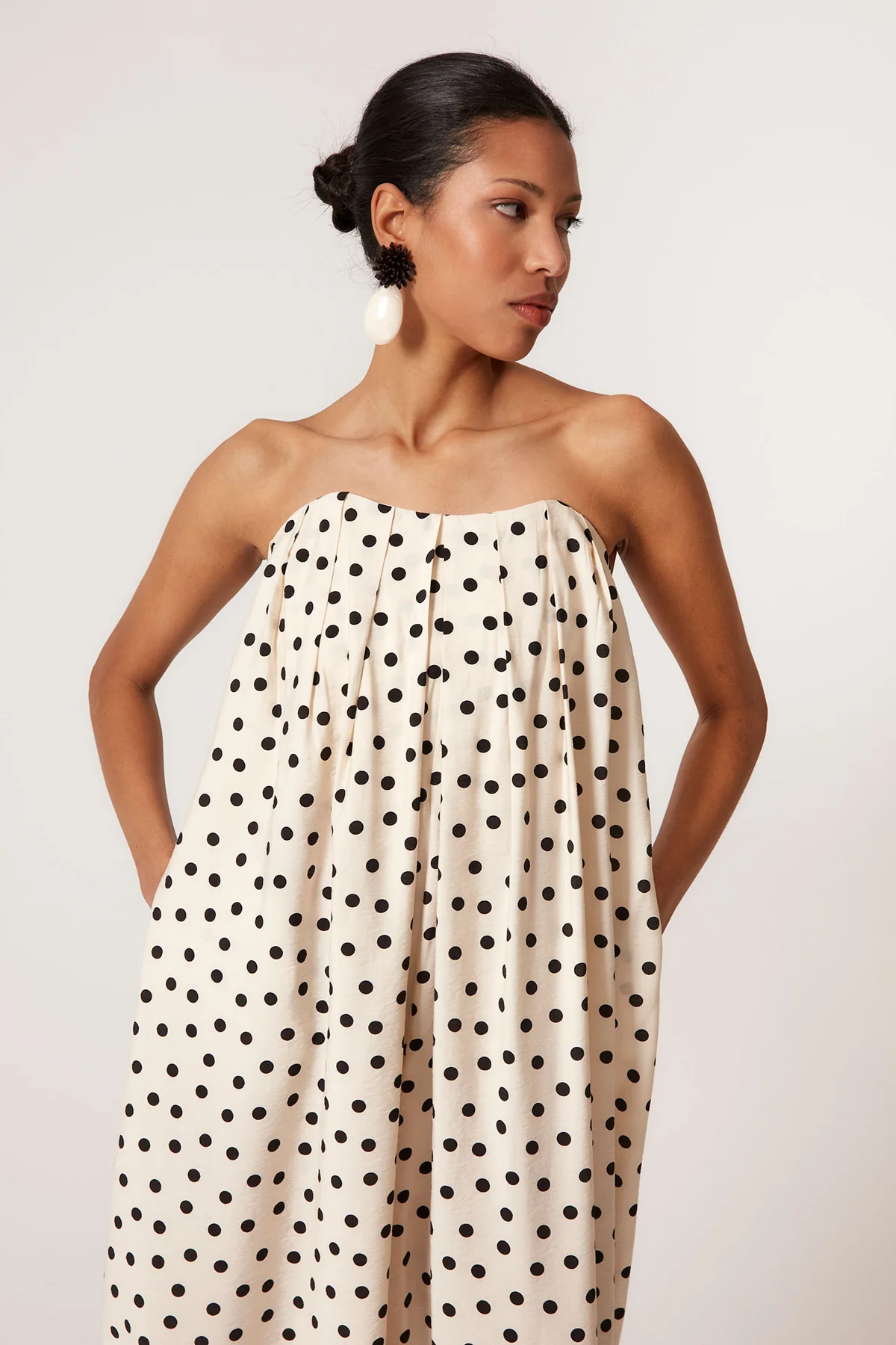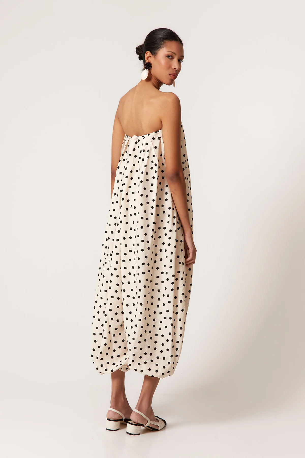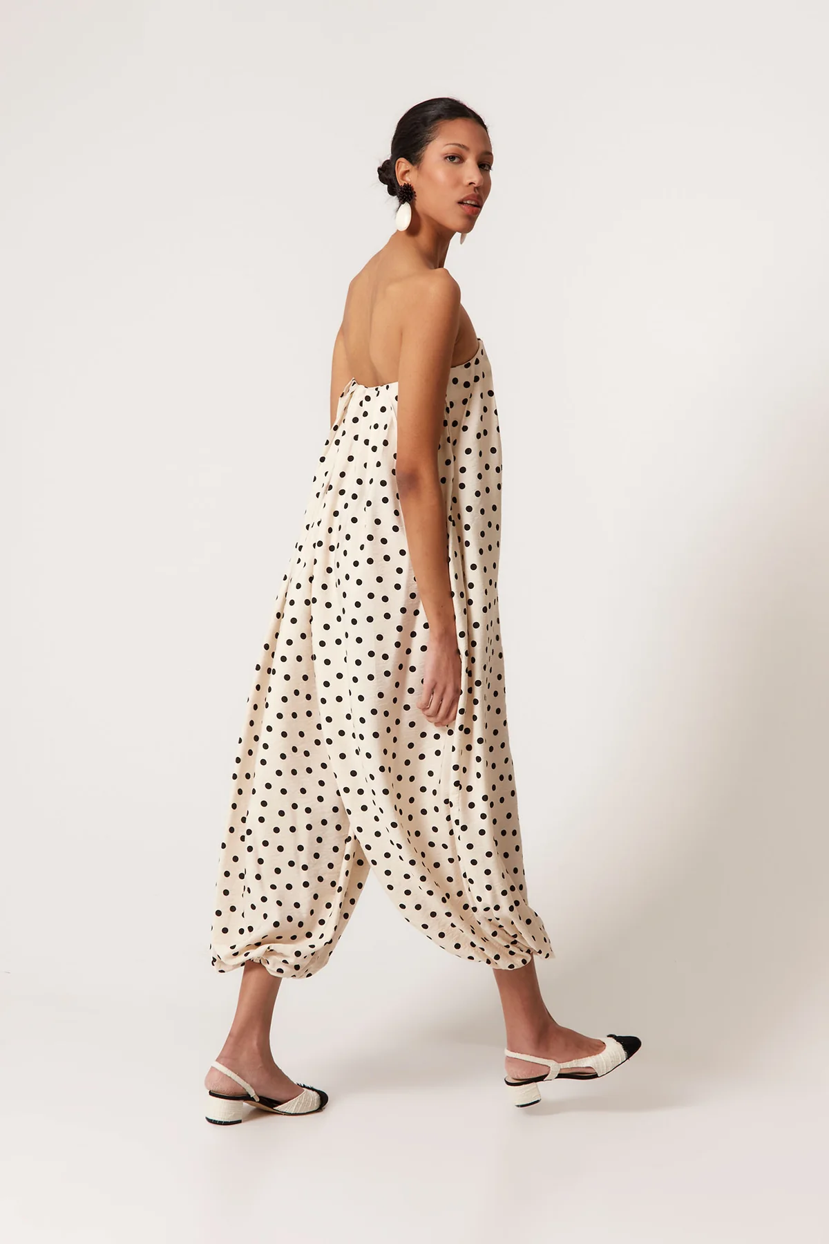 Confeccionado en tejido ligero de caída envolvente, este mono largo palabra de honor destaca por su estampado de lunares negros sobre fondo crudo, un clásico atemporal reinterpretado en clave contemporánea. El escote recto con frunce elástico proporciona comodidad y sujeción, adaptándose perfectamente a la silueta.