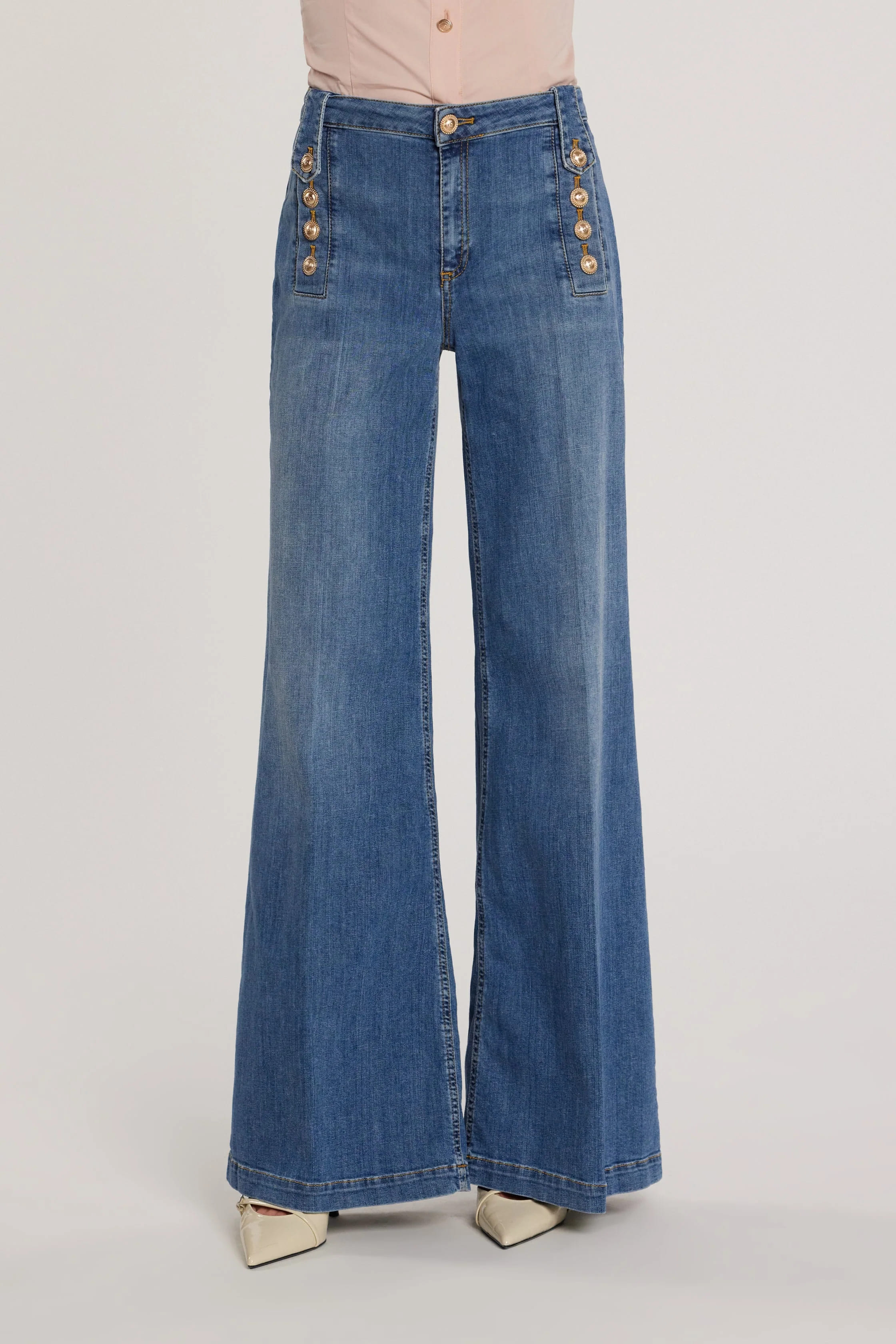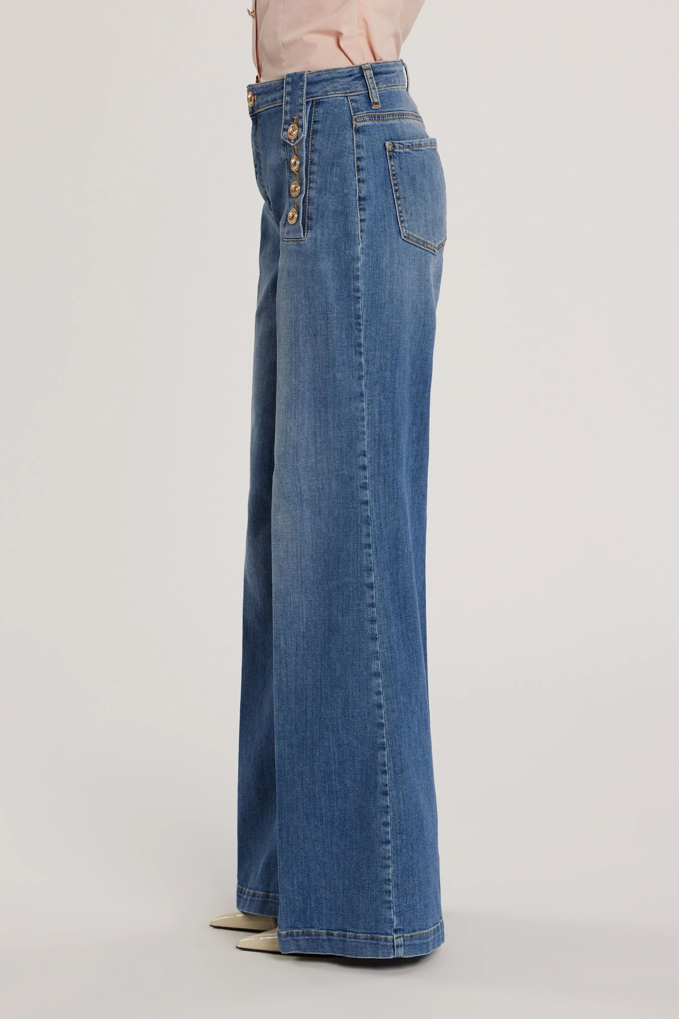 Pantalón Palazzo Talle Alto Mujer con Botones Denim