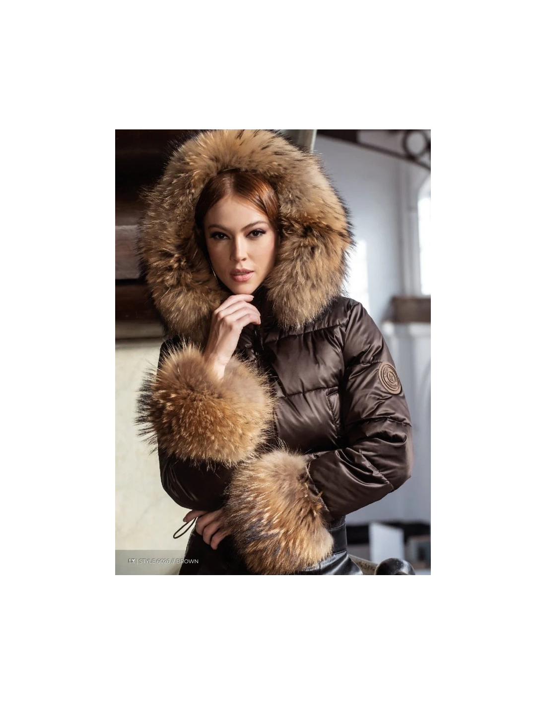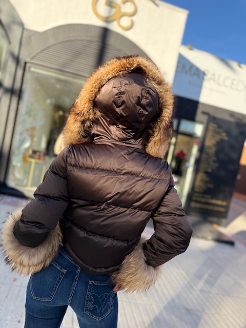 Plumas Corto Marrón Chocolate con Cuello y Puños de Zorro Natural