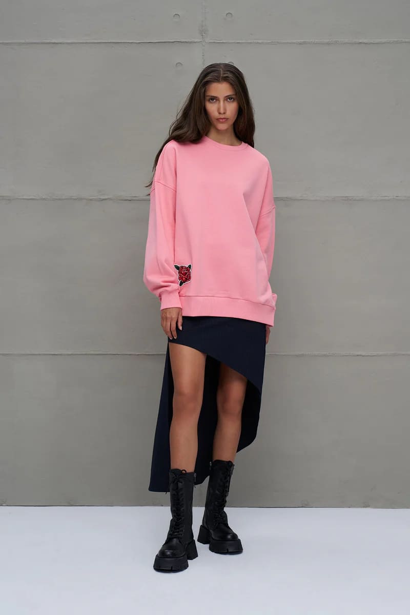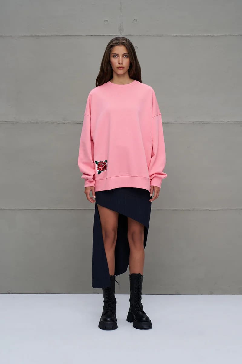 Sudadera de corte oversize en color rosa con cuello redondo, confeccionada en 100% algodón con forro polar interior que aporta calidez y comodidad. El diseño incluye un estampado de eslogan en la parte delantera y un parche bordado en la espalda, que le da un aire moderno y distintivo.