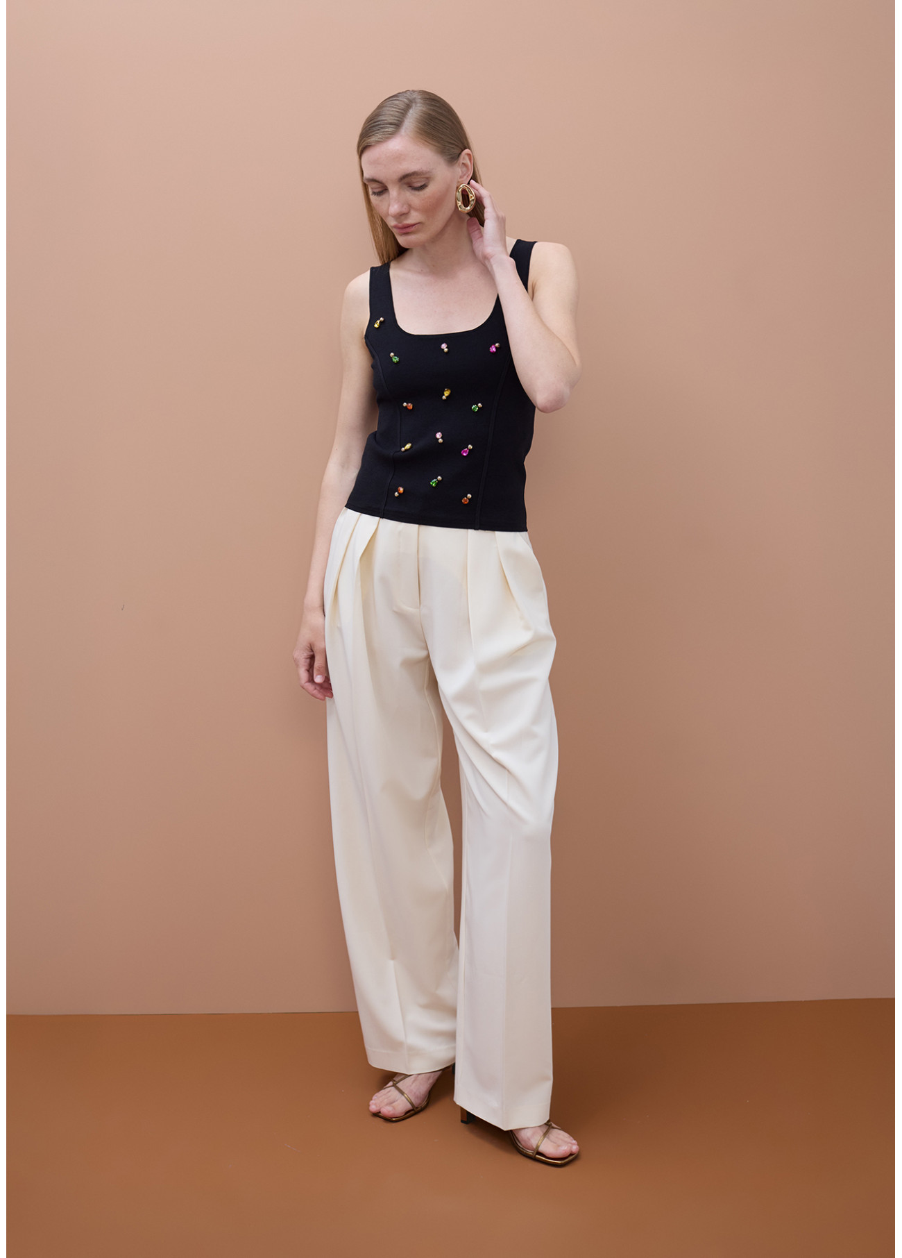 Top de punto ajustado con elegante detalle de joyas multicolor que aporta luz y sofisticación al look. Su diseño femenino con escote redondeado y tirantes anchos ofrece un ajuste cómodo y favorecedor.