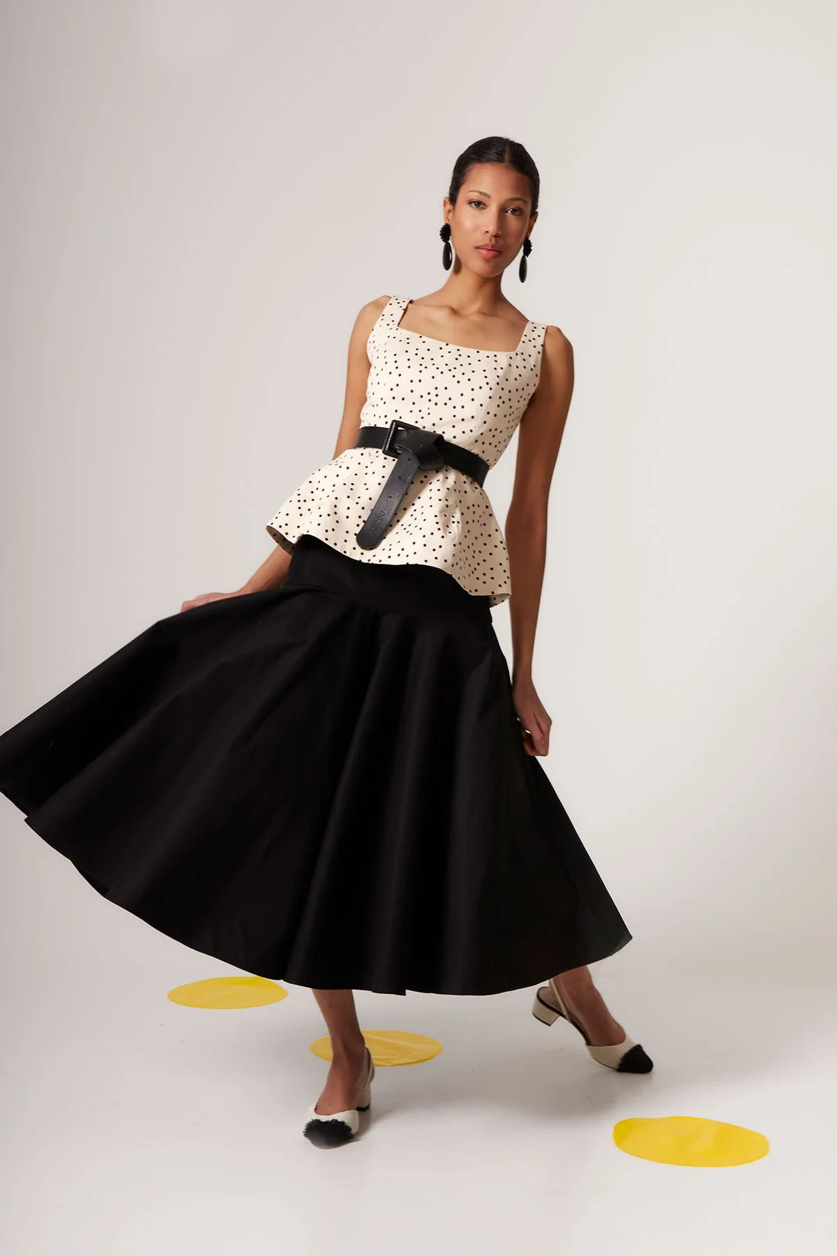 Confeccionado en tejido ligero con estampado de lunares negros sobre fondo crudo, este top elegante de mujer destaca por su escote cuadrado, que enmarca sutilmente los hombros y estiliza la zona del escote. Sus tirantes anchos aportan comodidad y estructura, mientras que el corte entallado en cintura con ligero volumen en el bajo crea un efecto peplum muy favorecedor que realza la silueta femenina.