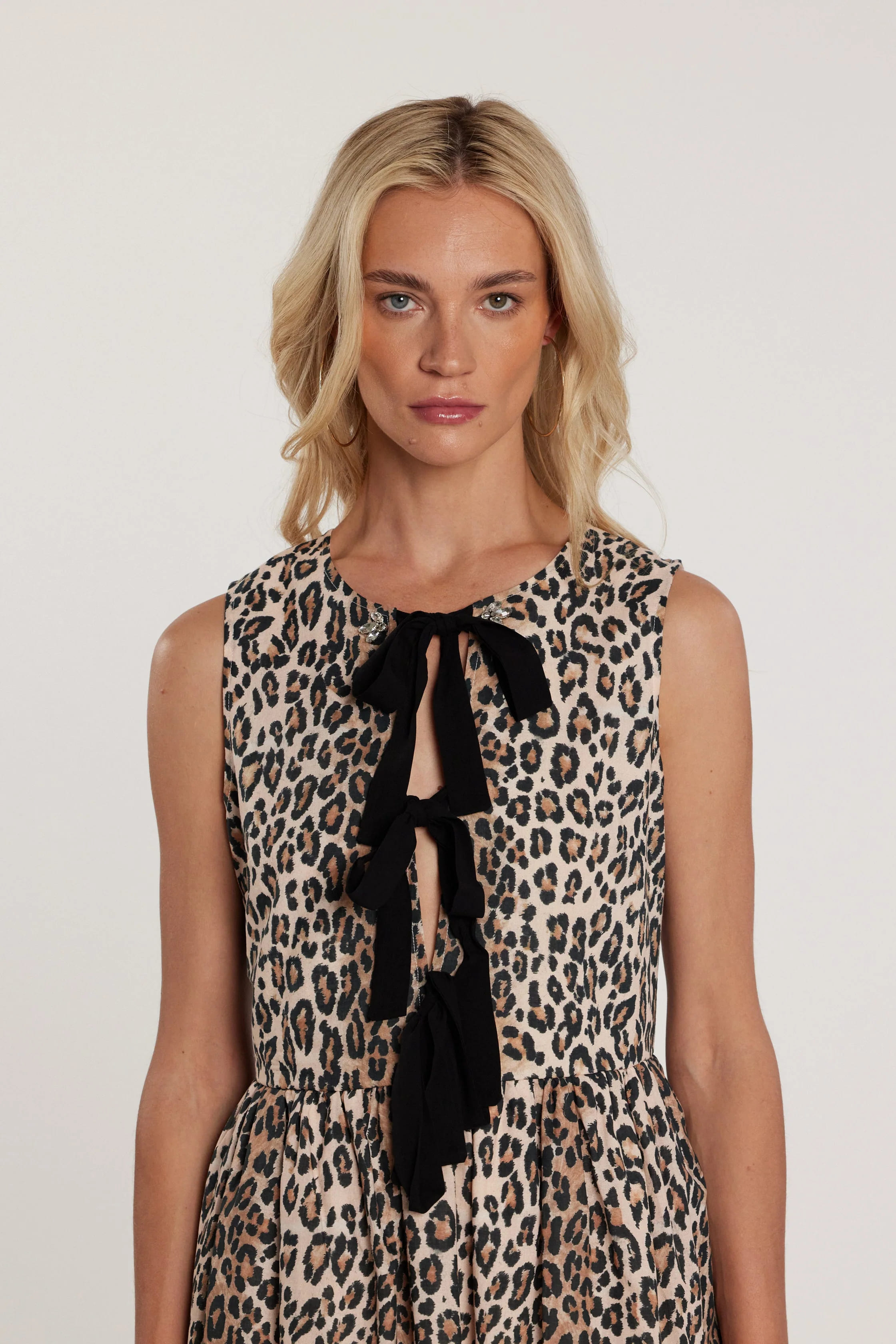 Decorado con lazos y aplicaciones de piedras fantasía con motivo animal, crea un efecto luminoso y dinámico que aporta carácter y sofisticación. Su corte favorecedor estiliza la figura, convirtiéndolo en la opción perfecta para eventos, celebraciones o looks especiales.