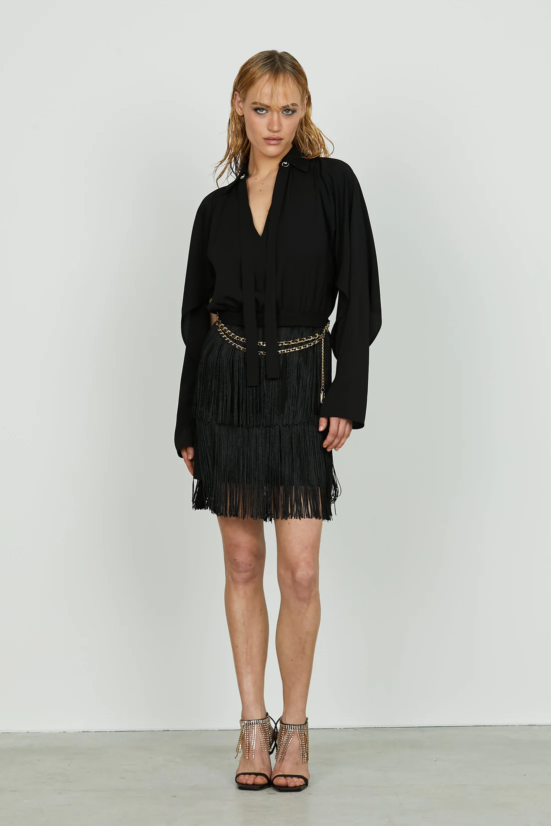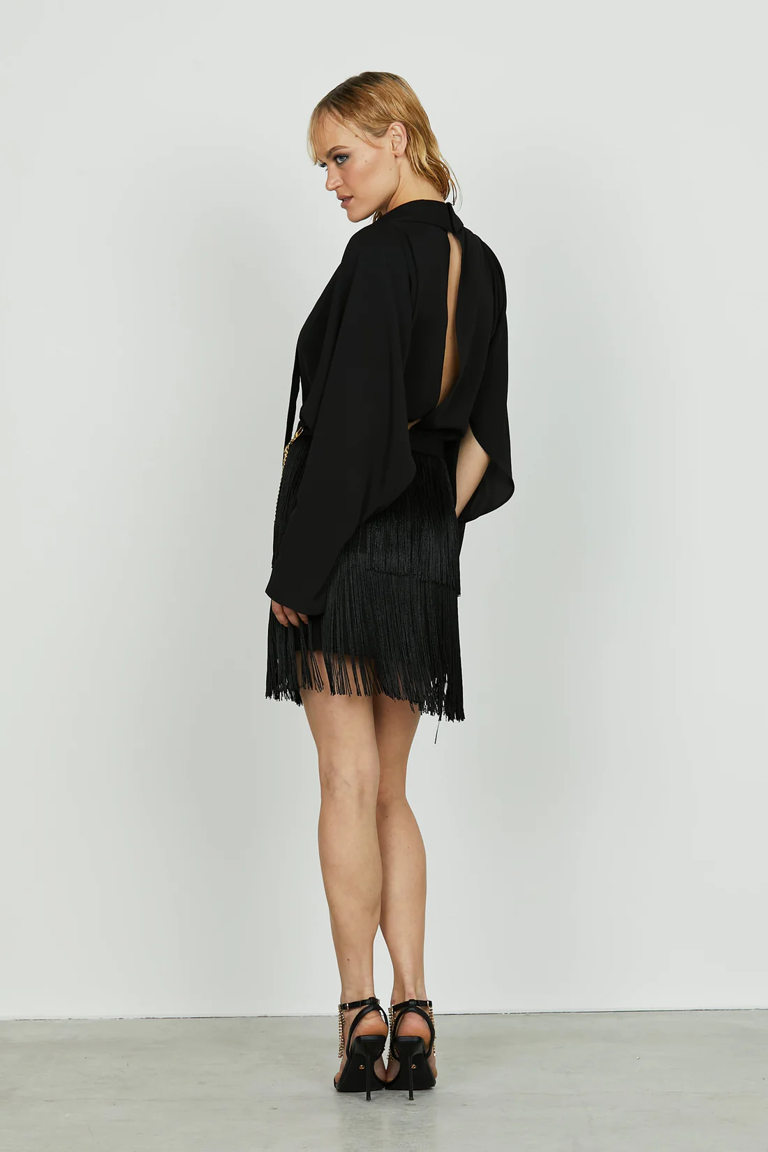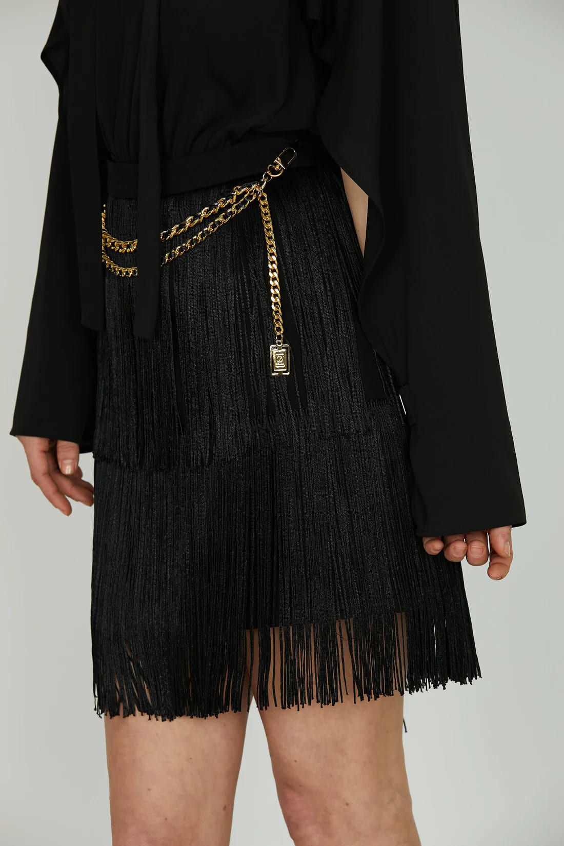 La parte superior presenta mangas largas, una cintura definida con cinturón coordinado, y detalles brillantes que elevan el diseño. La falda en corte línea A con flecos aporta movimiento y personalidad, y se puede retirar para adaptar el look a diferentes ocasiones. Un conjunto versátil ideal para fiestas, cenas o eventos de noche durante la temporada Otoño Invierno.