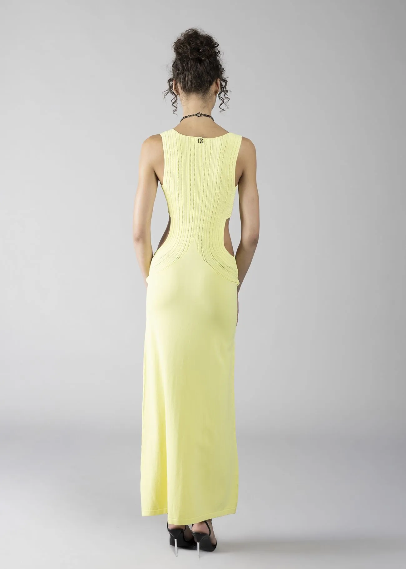 Vestido largo Denny Rose en color amarillo con un elegante diseño que estiliza la silueta femenina. Destaca por su favorecedor escote en V y sus aberturas laterales cut out, que aportan un toque moderno y sofisticado.