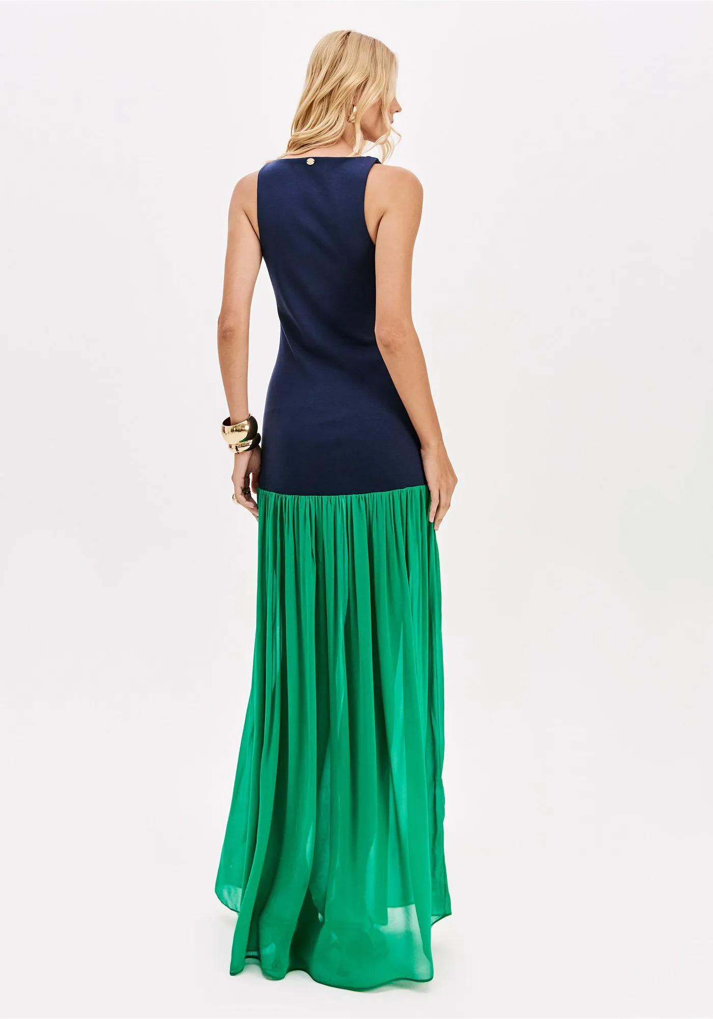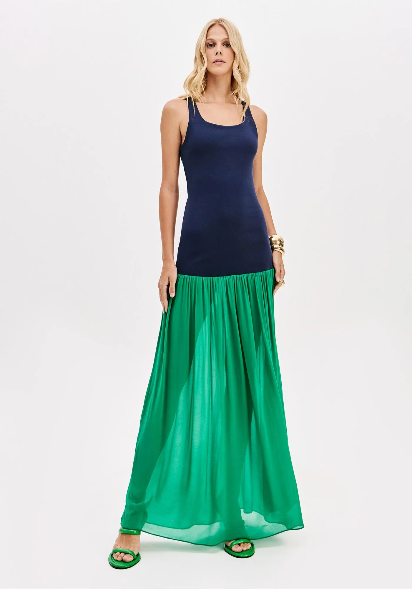 Descubre la elegancia contemporánea del vestido largo bicolor de Lança Perfume, una pieza sofisticada que combina comodidad y estilo en un diseño único. La parte superior está confeccionada en un punto suave y elástico en color azul marino, que se adapta perfectamente a la silueta realzando la figura con un ajuste favorecedor y muy cómodo. Su escote redondeado y diseño sin mangas aportan un aire minimalista y moderno, ideal para un look refinado.
