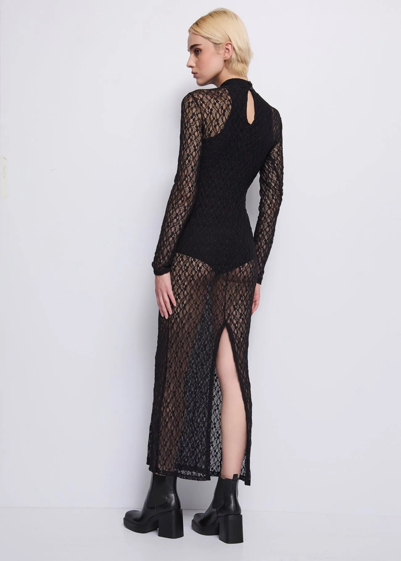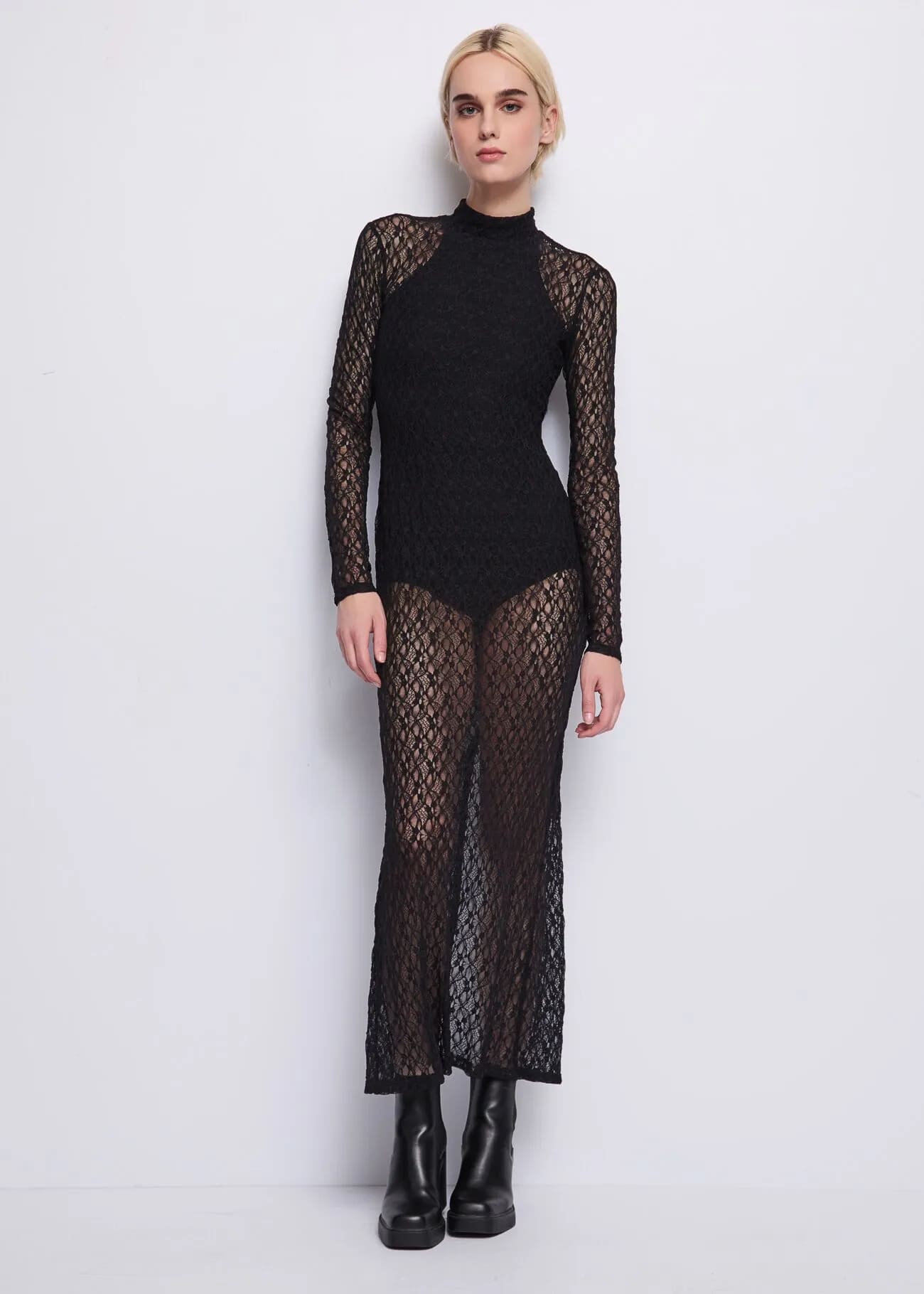 Elegante y sensual, este vestido largo denny rose de encaje elástico es la elección perfecta para eventos especiales, galas o noches con estilo. Su cuello alto con botones y la doble abertura en la espalda crean un equilibrio entre sofisticación y atractivo. Las mangas largas aportan un aire refinado, mientras que el forro interior completo garantiza comodidad y cobertura. Confeccionado en un tejido suave, elástico y delicado, este vestido envuelve la silueta con elegancia sin sacrificar el confort. Ideal para destacar con personalidad y clase. Características destacadas: Vestido largo ajustado de encaje elástico Cuello alto con cierre de botones Abertura en la espalda doble Mangas largas Forro interior completo Tejido exterior: 95% poliéster, 5% elastano Forro: 95% poliéster, 5% elastano