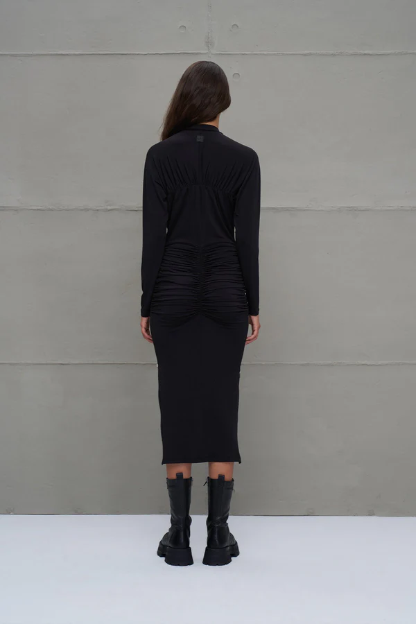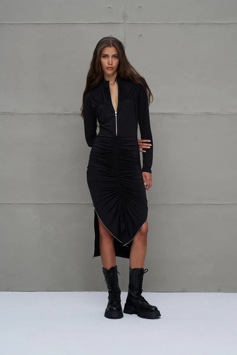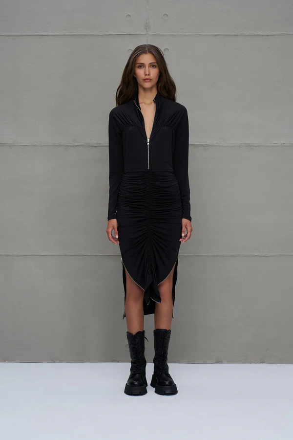 El diseño incluye un cuello alto, manga larga y una cremallera frontal visible que aporta un toque moderno y funcional. El detalle drapeado en las caderas crea un efecto corsé que estiliza la silueta, mientras que el largo del vestido aporta equilibrio y presencia.