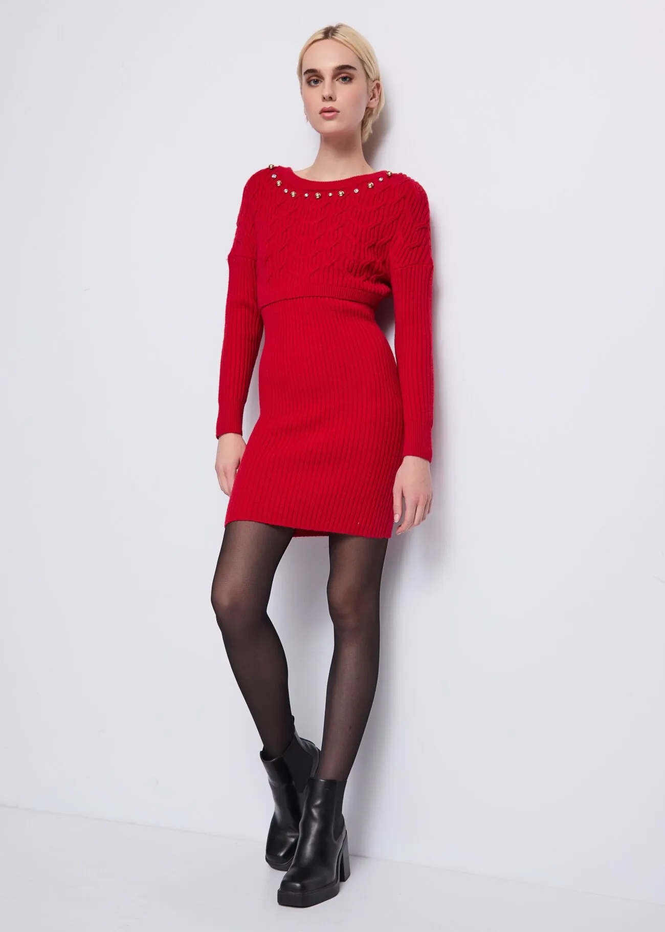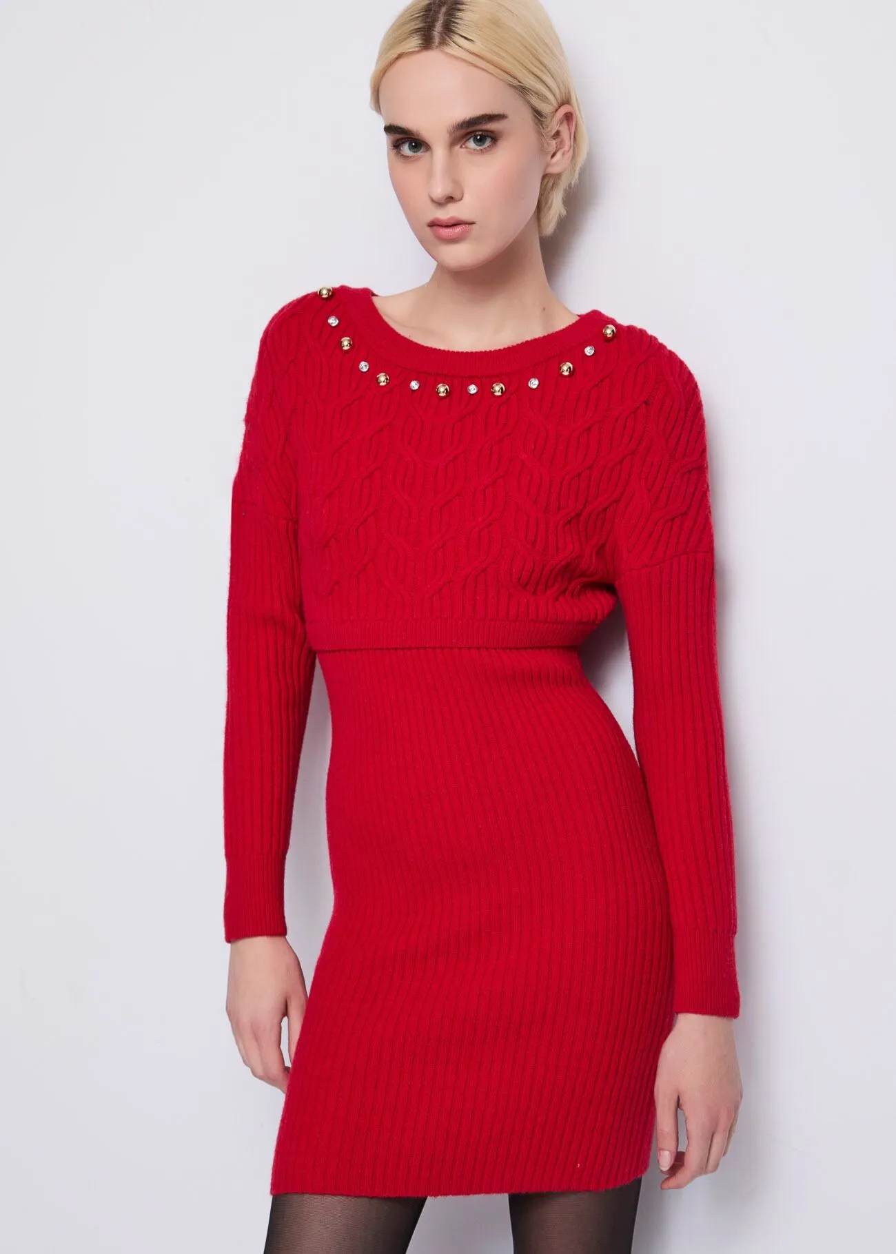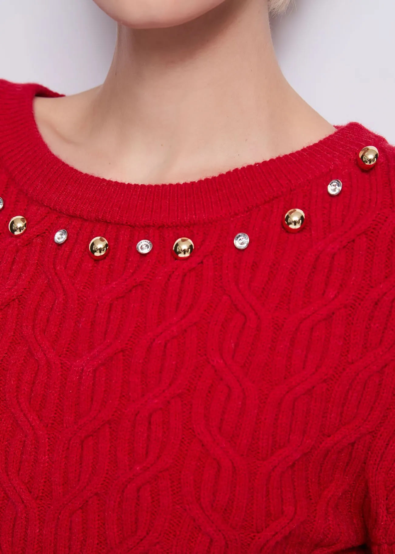 El diseño presenta cuello redondo, mangas largas y un corte favorecedor, realzado por apliques de pedrería y mini tachuelas cuidadosamente distribuidos sobre el tejido. Un detalle elegante que ilumina el look sin perder comodidad.