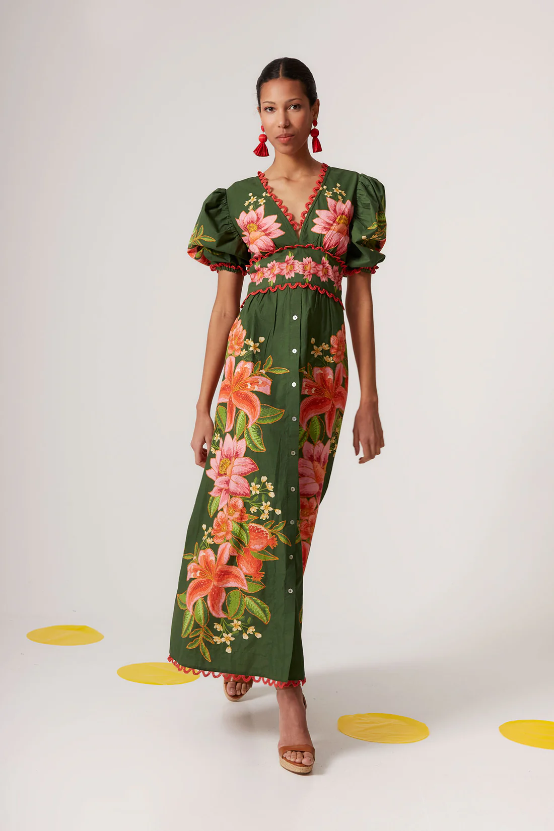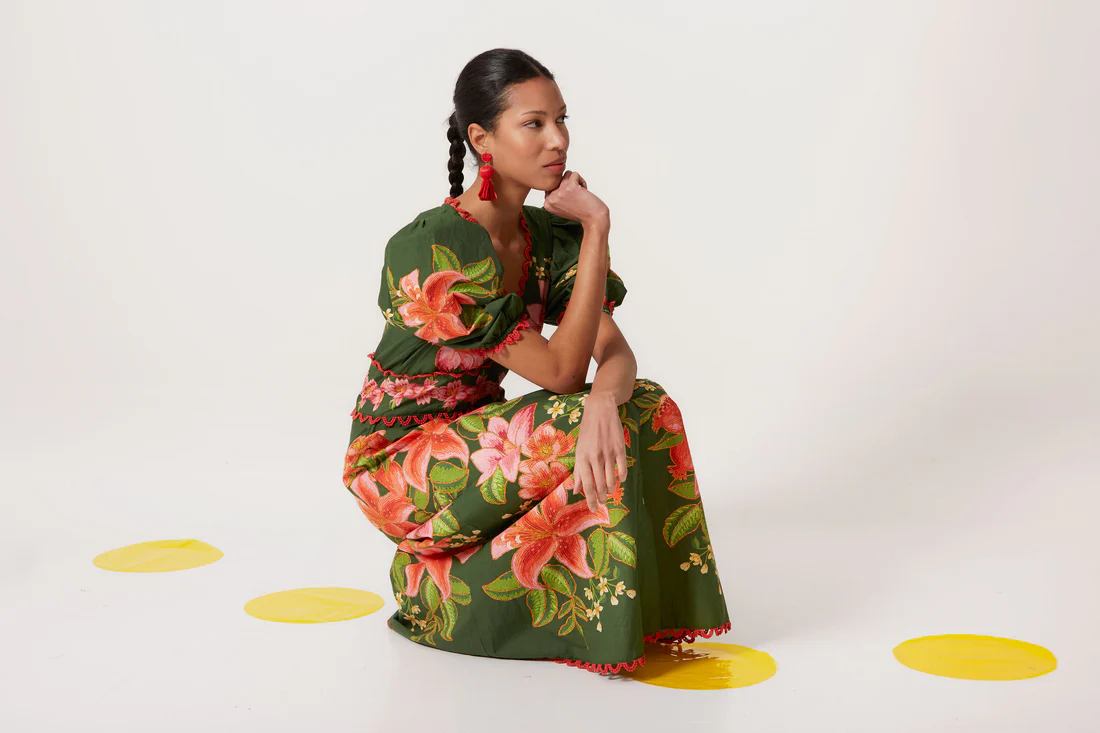 Vestido largo de corte elegante con escote en V pronunciado que estiliza el busto y resalta el cuello de manera sofisticada. Presenta mangas cortas abullonadas, que aportan volumen y un aire romántico y moderno al mismo tiempo. La cintura está definida con un fruncido y un delicado detalle de bordado floral, creando una silueta femenina y armoniosa. El vestido cuenta con un cierre de botones en la parte delantera que añade funcionalidad y un toque de estilo clásico. Su tejido verde profundo sirve de base para un vibrante estampado floral en tonos rosa, coral y amarillo, generando un contraste llamativo y lleno de vida. Los bordes de las mangas y del bajo están adornados con un sutil ribete rojo, que aporta un detalle artesanal y elegante. Este diseño combina un aire romántico, sofisticado y artístico, ideal para eventos especiales, celebraciones al aire libre o cualquier ocasión en la que se busque un look distintivo y con personalidad. Su mezcla de colores y detalles hace que sea un vestido que llama la atención sin perder la elegancia. 100% ALGODÓN