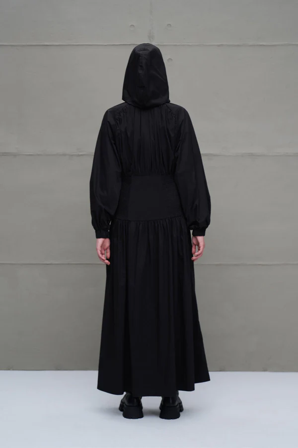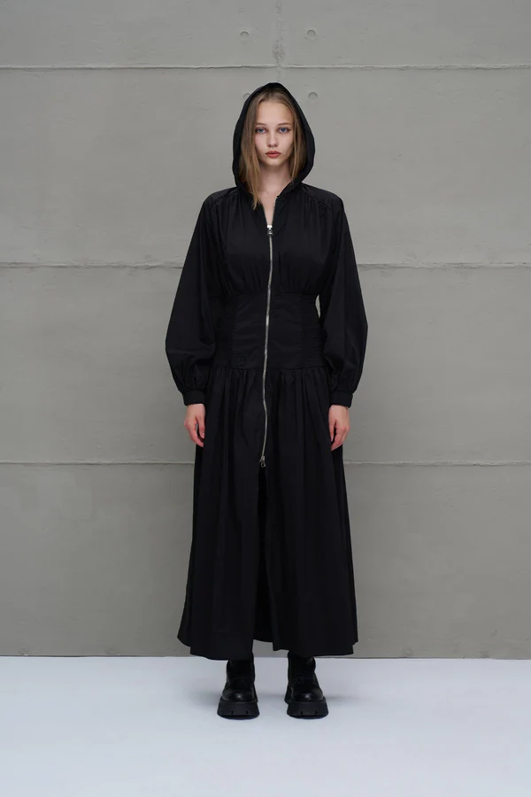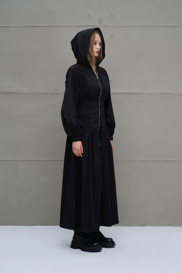 El vestido negro largo de VDR es una prenda de inspiración urbana con toques deportivos y femeninos. Su corte ajustado realza la silueta, mientras que el cordón en la cintura permite adaptarlo al cuerpo como un corsé moderno.