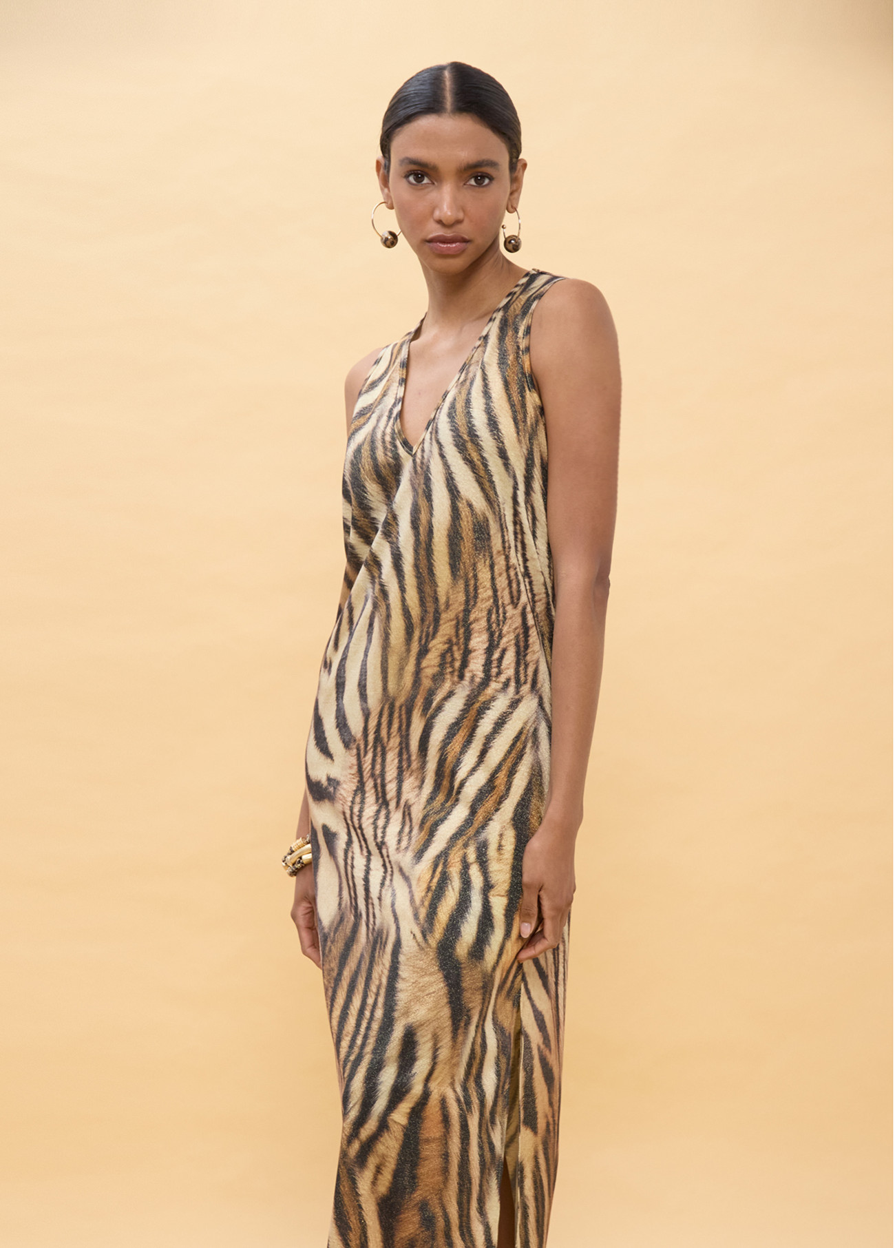 Vestido sin mangas con elegante estampado animal en tonos cálidos que aporta carácter y sofisticación al look. Su diseño fluido ofrece una caída ligera y favorecedora, ideal para los días y noches de verano.