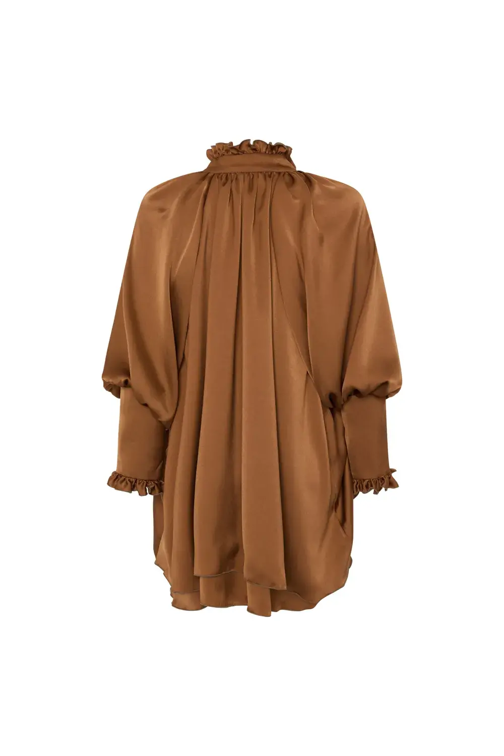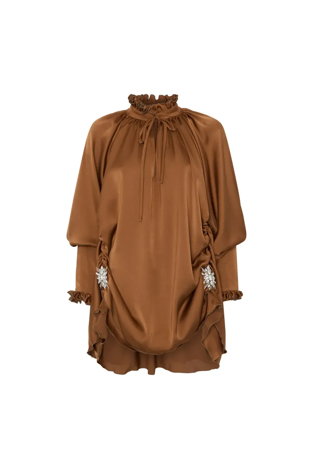 El vestido con fruncidos y detalles joya de Tete by Odette es una pieza elegante y con carácter, perfecta para destacar en eventos especiales. Confeccionado en un delicado tejido fluido color caramelo, presenta un diseño suelto y femenino con cuello alto tipo lazada, mangas largas abullonadas y fruncidos laterales que estilizan la silueta. Los aplicados joya en los costados aportan un toque sofisticado y único, característico de las ediciones limitadas de la firma. Ideal para una cena formal, una fiesta o una ocasión especial donde quieras destacar con estilo.