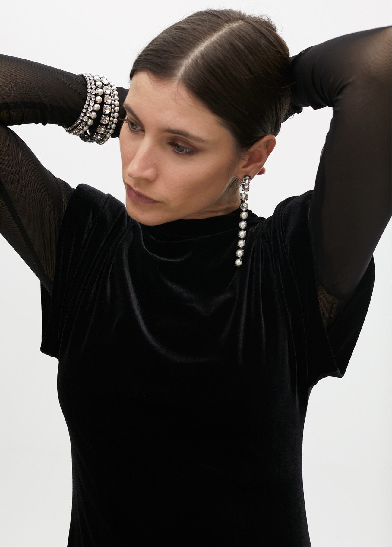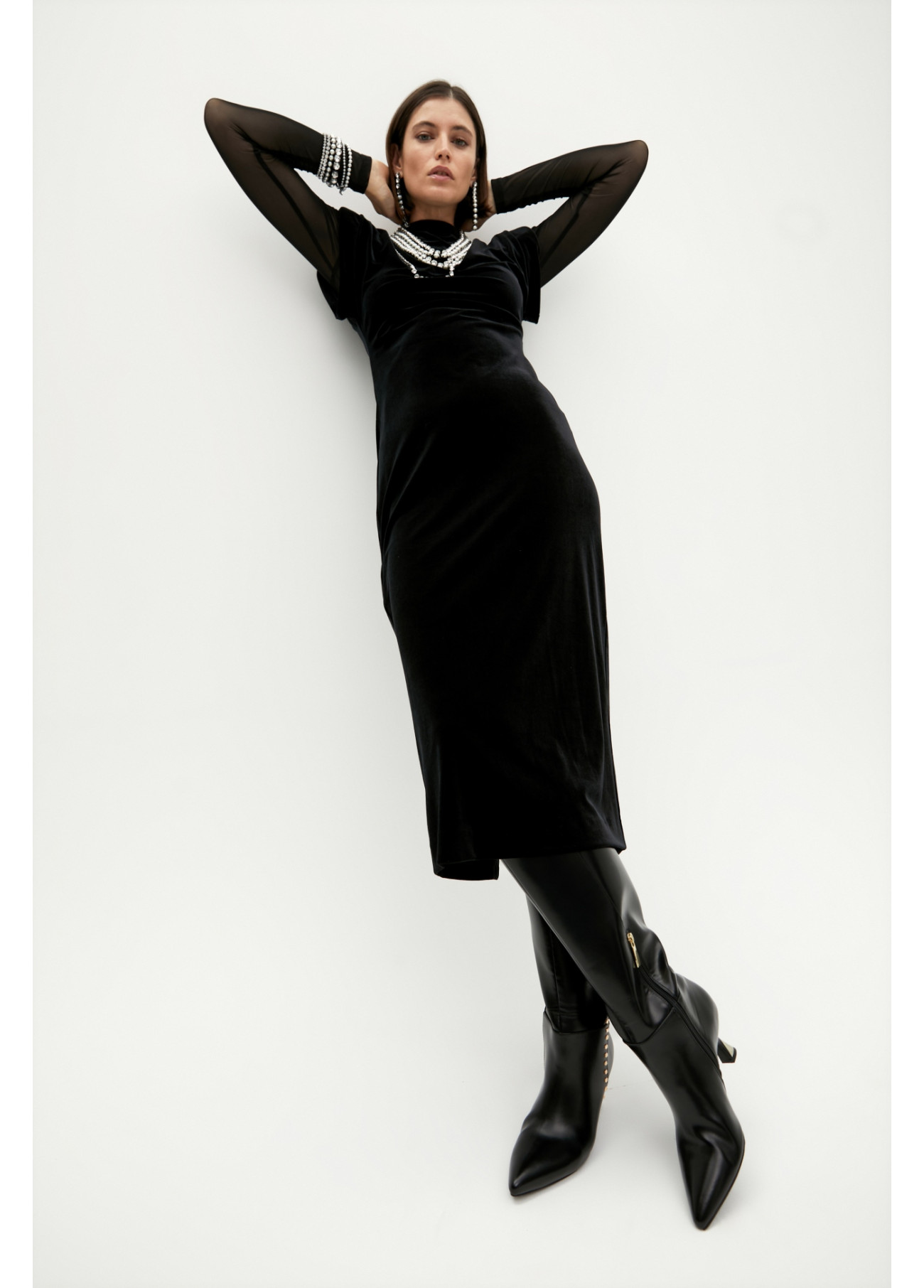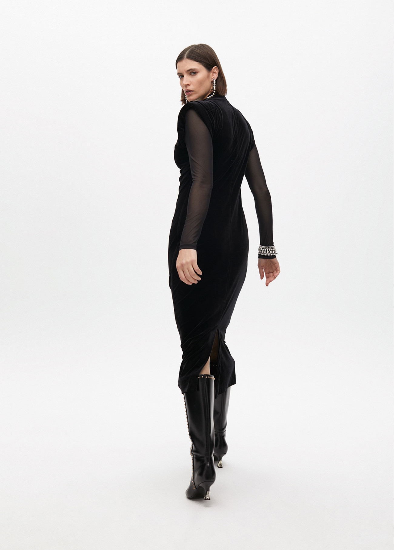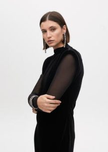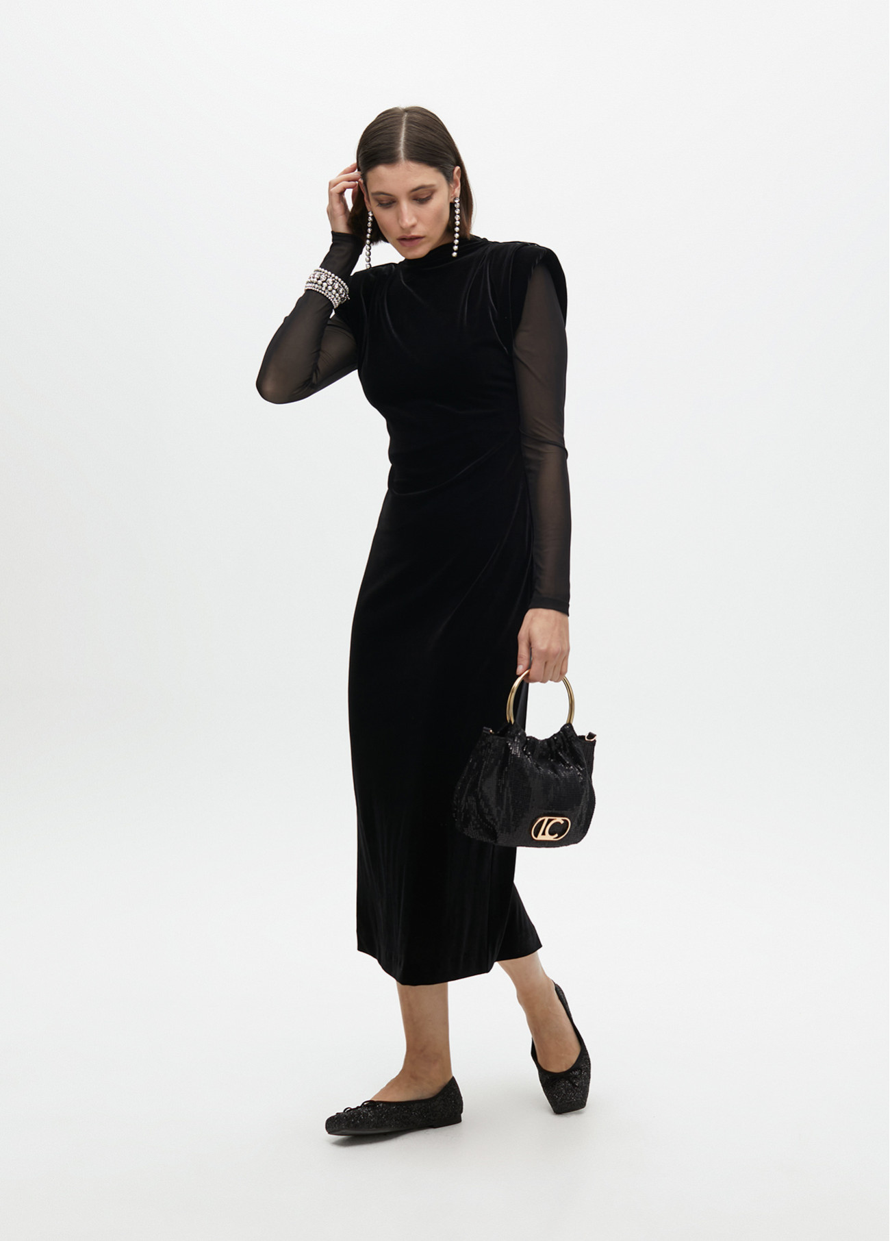 Imponente y elegante, el vestido velvet negro midi de Lola Casademunt es una pieza de impacto para cualquier ocasión especial. Confeccionado en terciopelo negro suave y estructurado, presenta mangas largas de tul ajustadas que aportan contraste y sofisticación, y unos hombros marcados que estilizan la figura y elevan el diseño.
